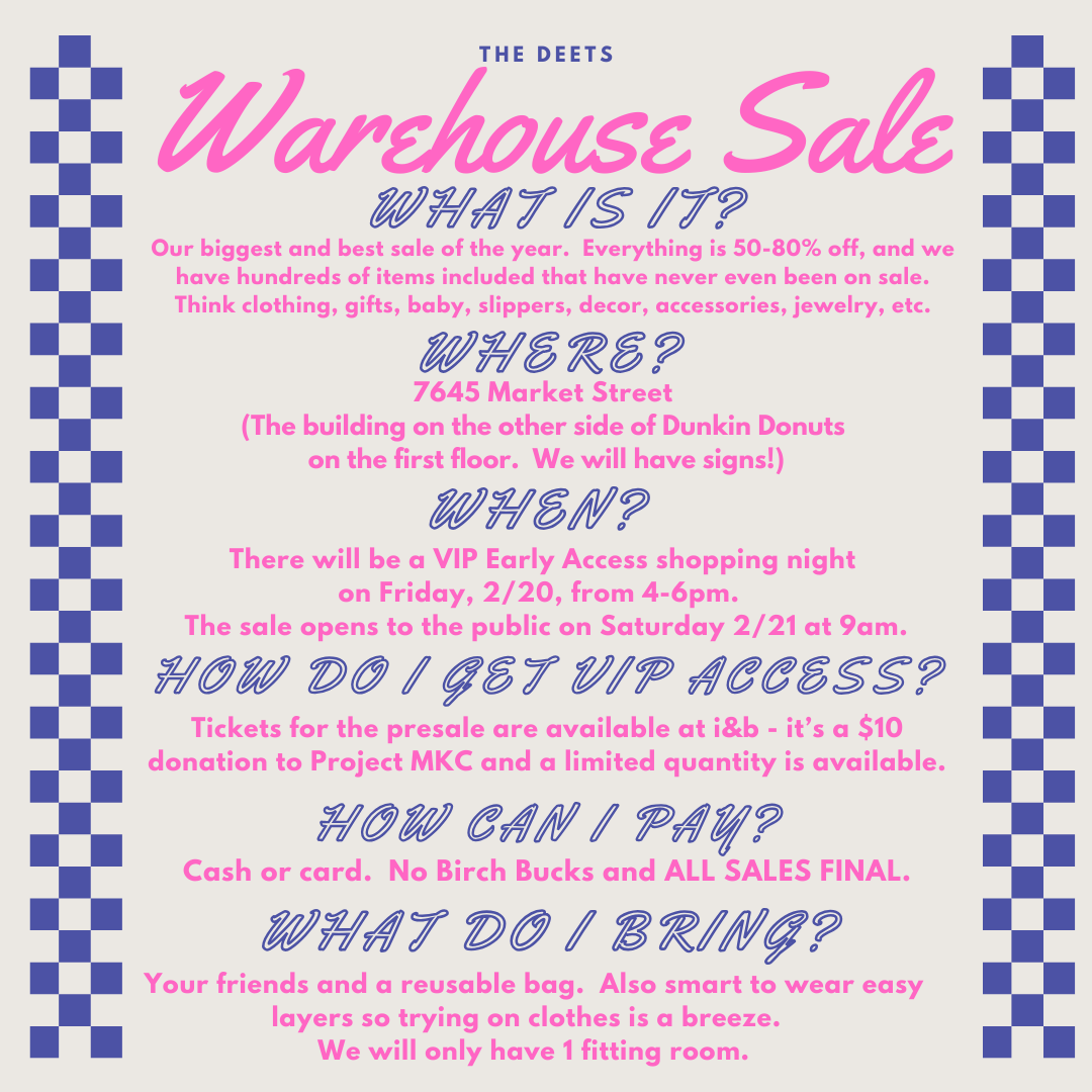 $10 Early Access Donation Ticket - Warehouse Sale(0) $10.00 Excl. tax In stock (1) Available in store:Check availabilityAdd to cartLogin for wishlistQuick OrderFree shipping From $200.00DescriptionShareYour $10 donation gets you early access to our best sale of the year! Shop from 4-6pm on Friday, 2/20, before the sale is open to the public on the 21st. 100% of the ticket sales will be donated to Project MKC. Facebook Pin it WhatsappAdd to comparison list