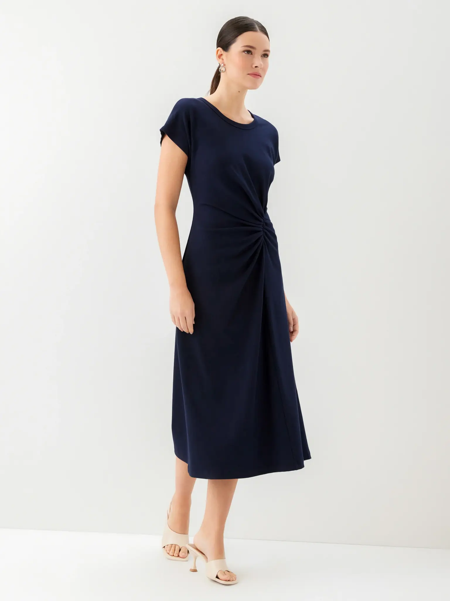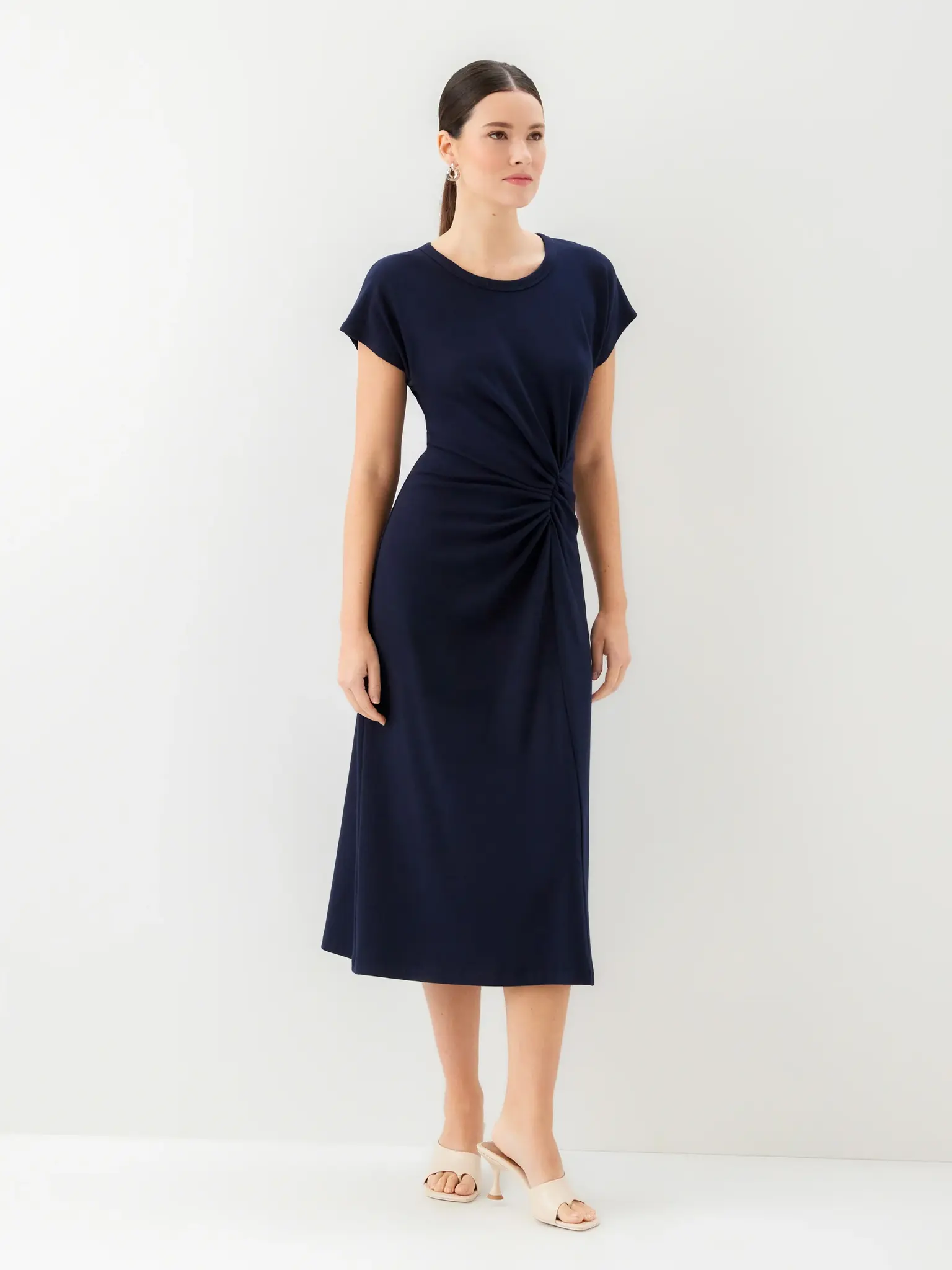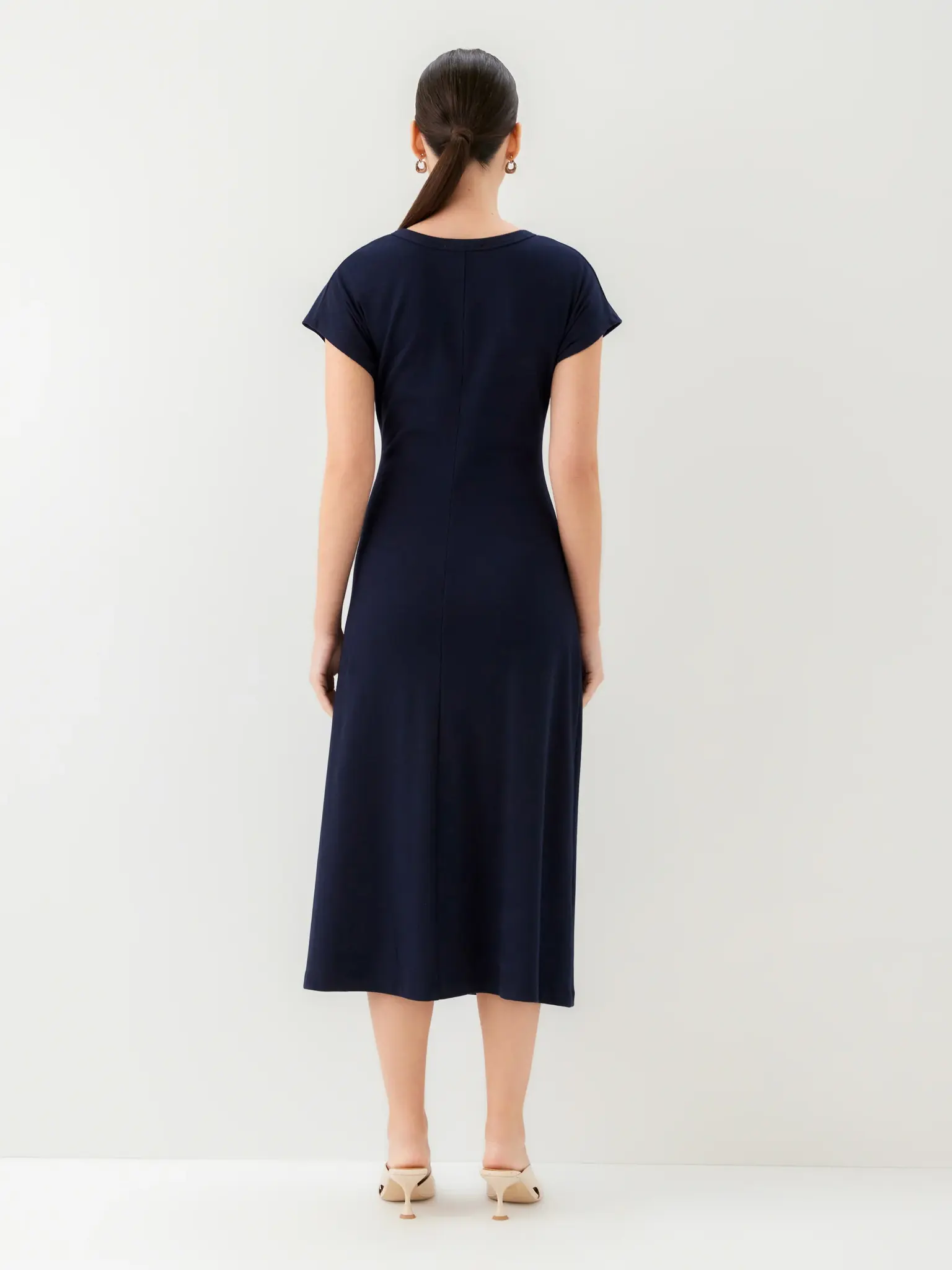 - Midi length with a fitted shape through the waist and a relaxed skirt.