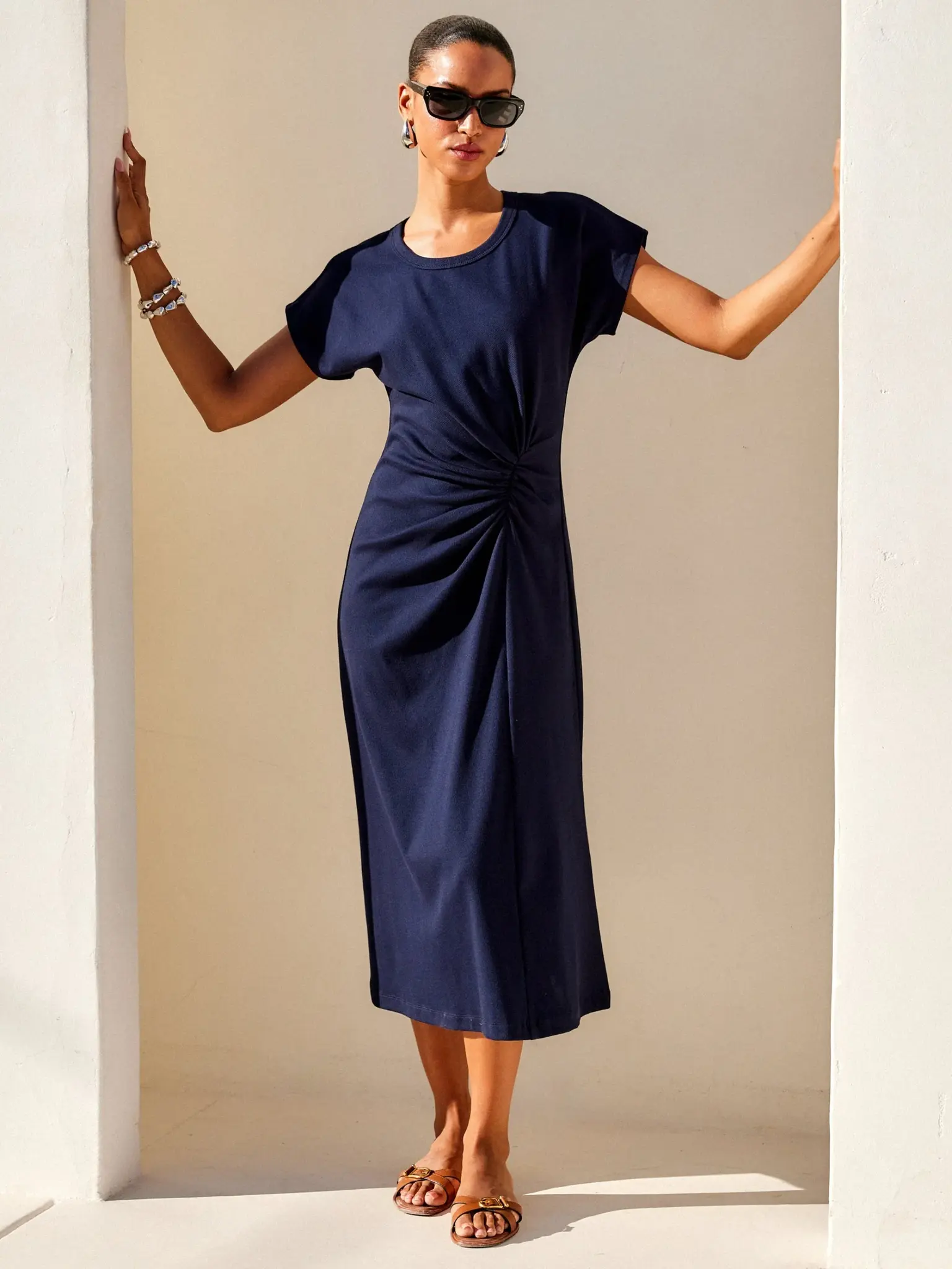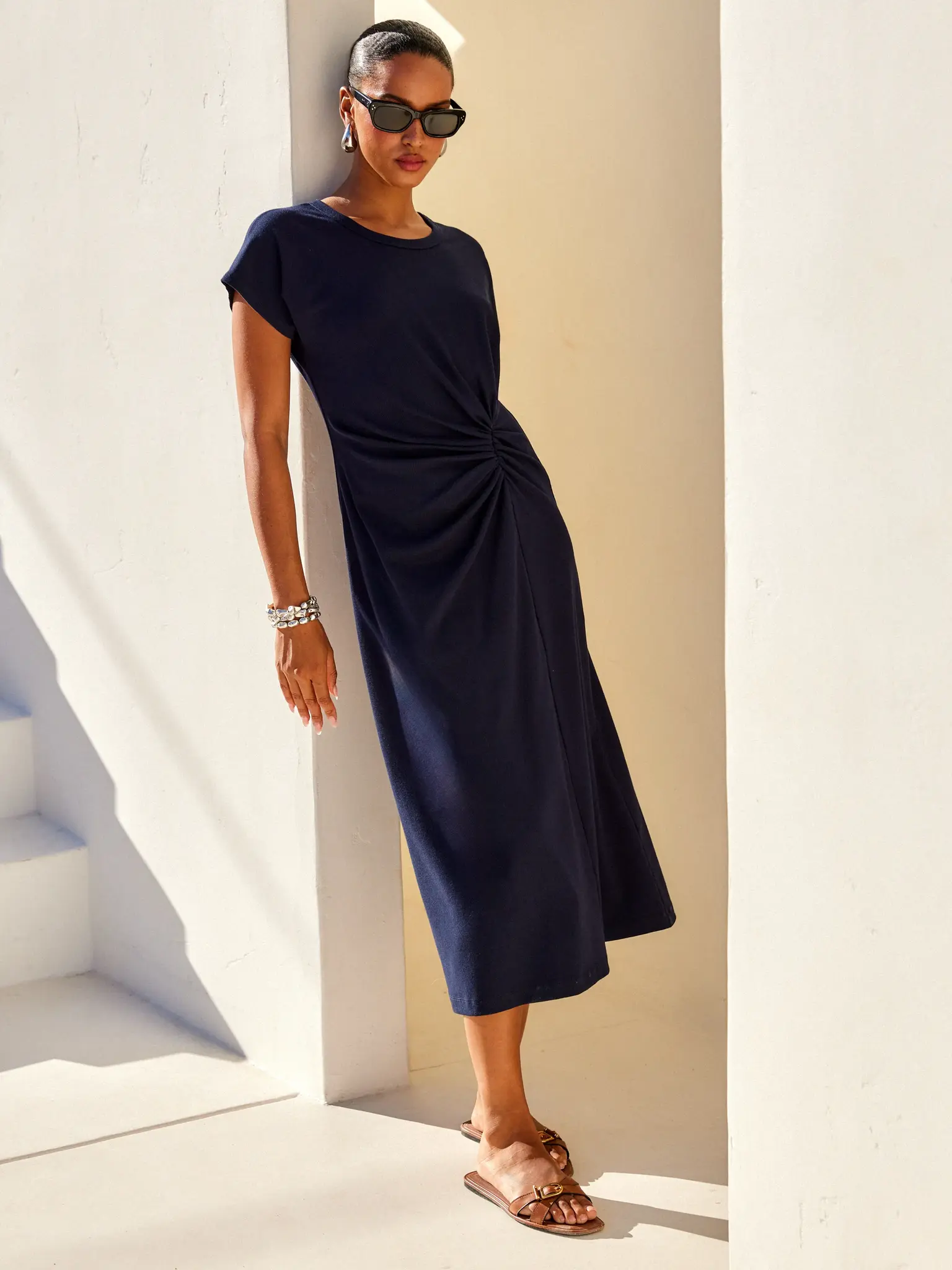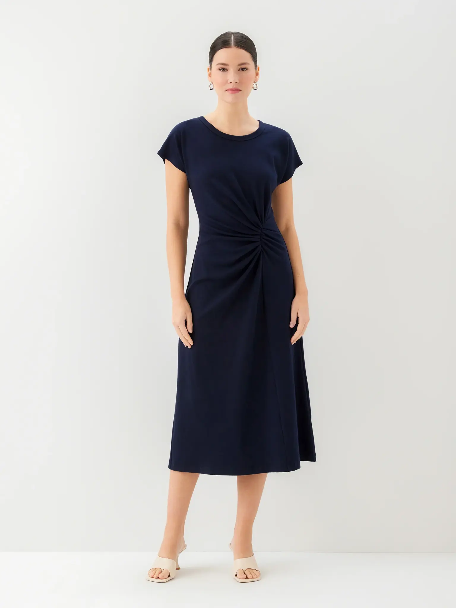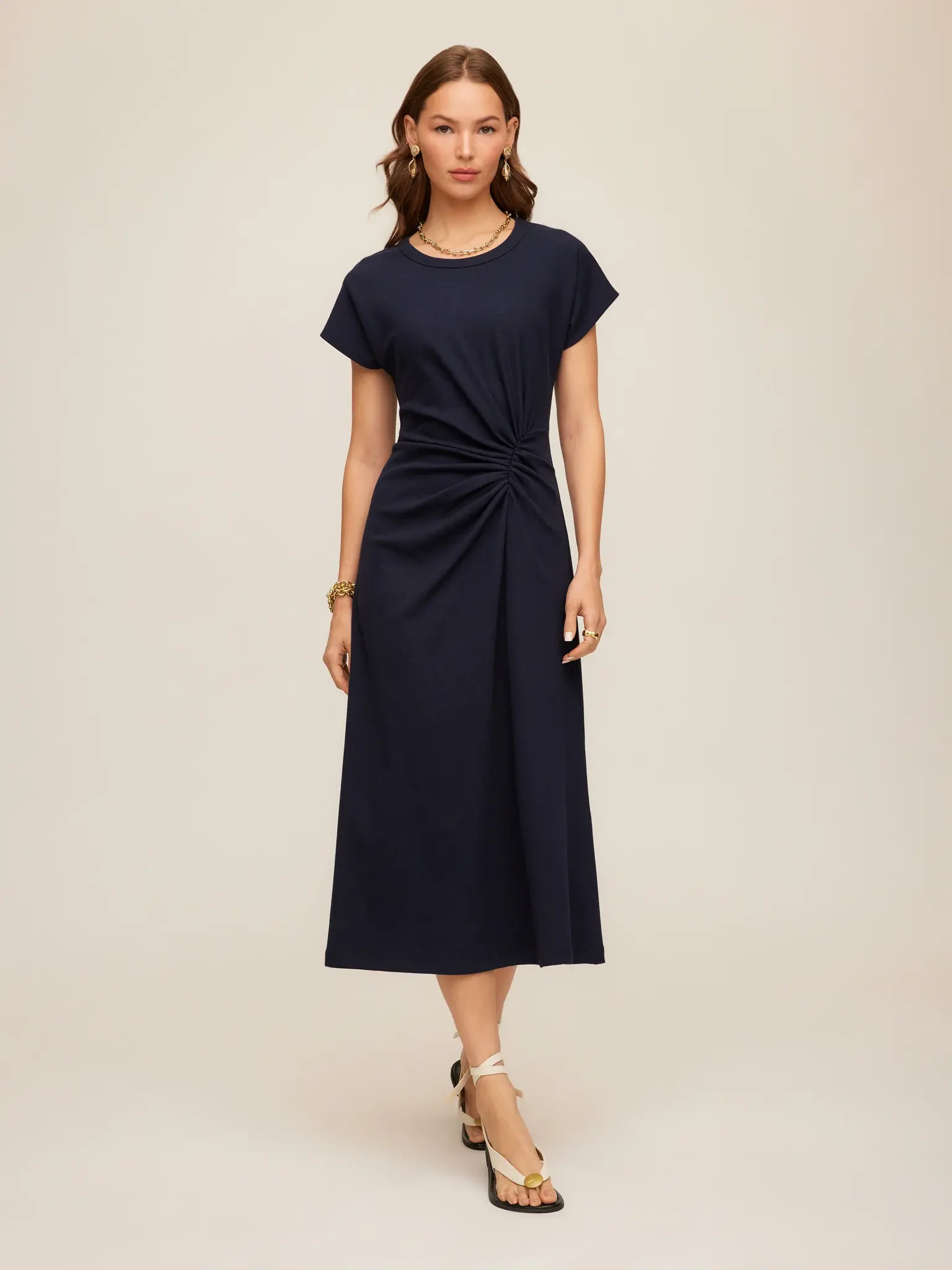 - Midi length with a fitted shape through the waist and a relaxed skirt.