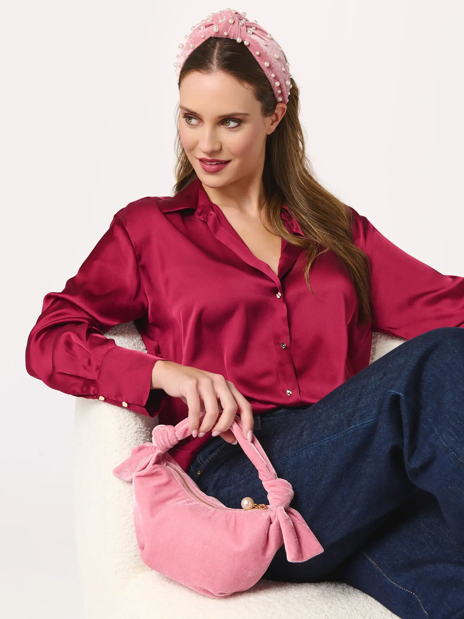 Featuring a single top handle, a top zip closure accented with a faux pearl, and one inner zip pocket, it’s a stylish companion for day or night. Compact but roomy enough for your essentials, it’s designed to be both cute and practical. Whether you’re brunch-bound or party-ready, this little number adds the perfect polished touch.