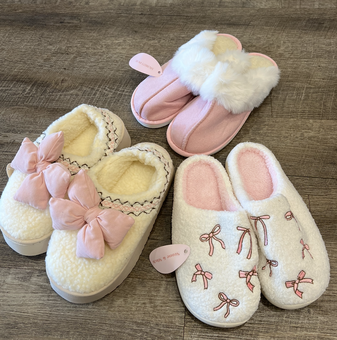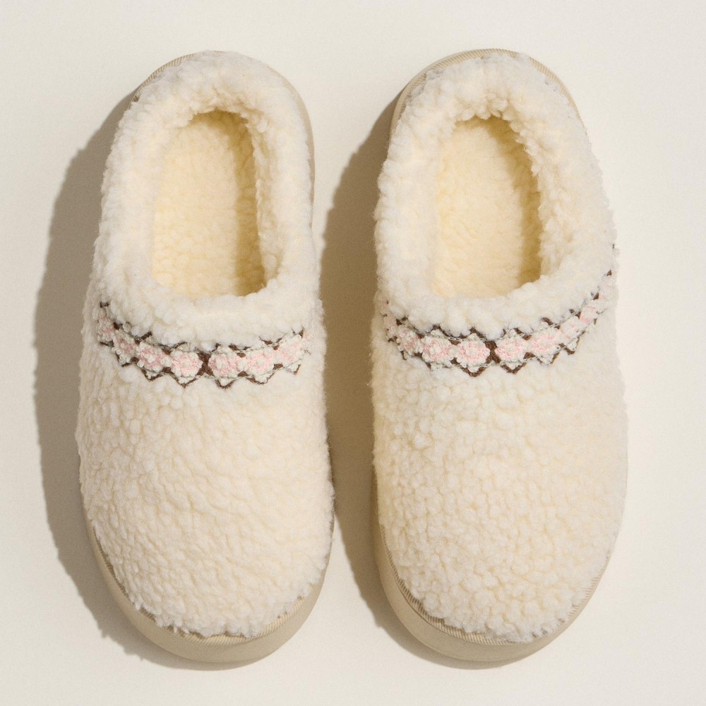 -Platform Sherpa Slippers with Removable Puffy Bow and delicate floral embroidery