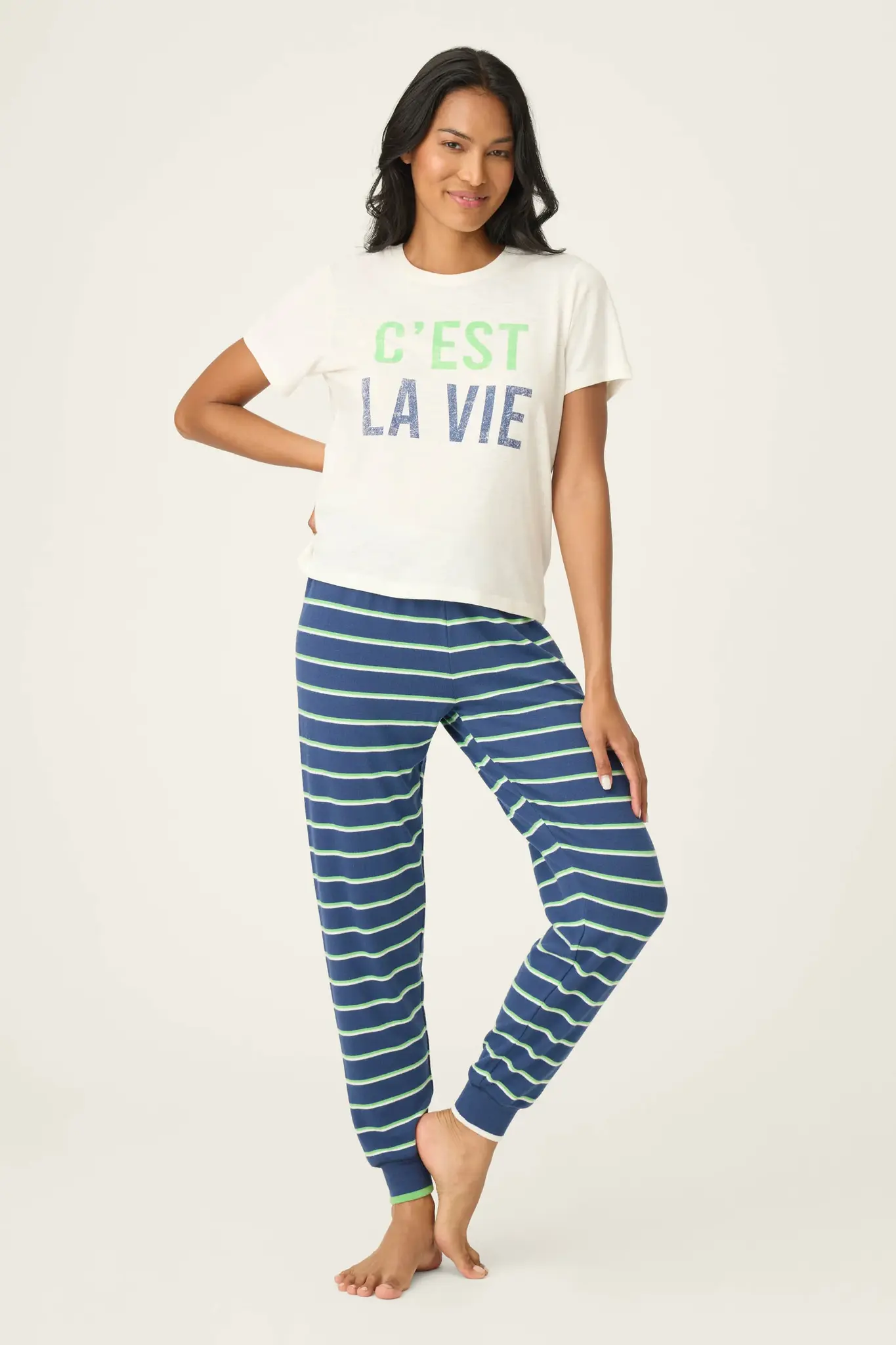 C'est La Vie Tee -(0) $54.00 Excl. tax In stock (1) Make a choiceSize : SSize : MSize: *SMAvailable in store:Check availabilityAdd to cartLogin for wishlistQuick OrderFree shipping From $200.00DescriptionShareLightweight and easygoing, this peach jersey graphic tee brings a playful touch to your lounge lineup. Designed in soft ivory with a relaxed silhouette, it features a two-tone “C’est La Vie” graphic in soft green and washed navy. Facebook Pin it WhatsappAdd to comparison list