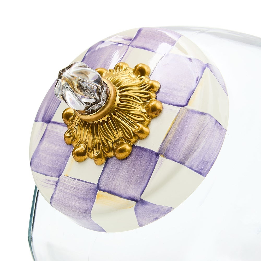 Glass jar; lid has heavy-gauge, hand-glazed steel underbody with hand-painted Violet Checks. Knob assembly includes brass bobeche and glass finial. Pieces may vary due to the handmade nature of each product. Imported.