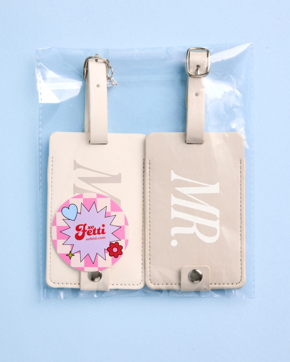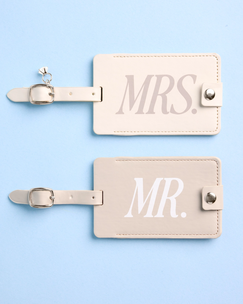 xo, FettiMr. & Mrs. Luggage Tags(0) $14.00 Excl. tax In stock (5) Available in store:Check availabilityAdd to cartLogin for wishlistQuick OrderFree shipping From $200.00DescriptionShareThe XO Fetti Mr and Mrs luggage tags set includes two neutral faux leather tags designed for modern wedding travel. Facebook Pin it WhatsappAdd to comparison list