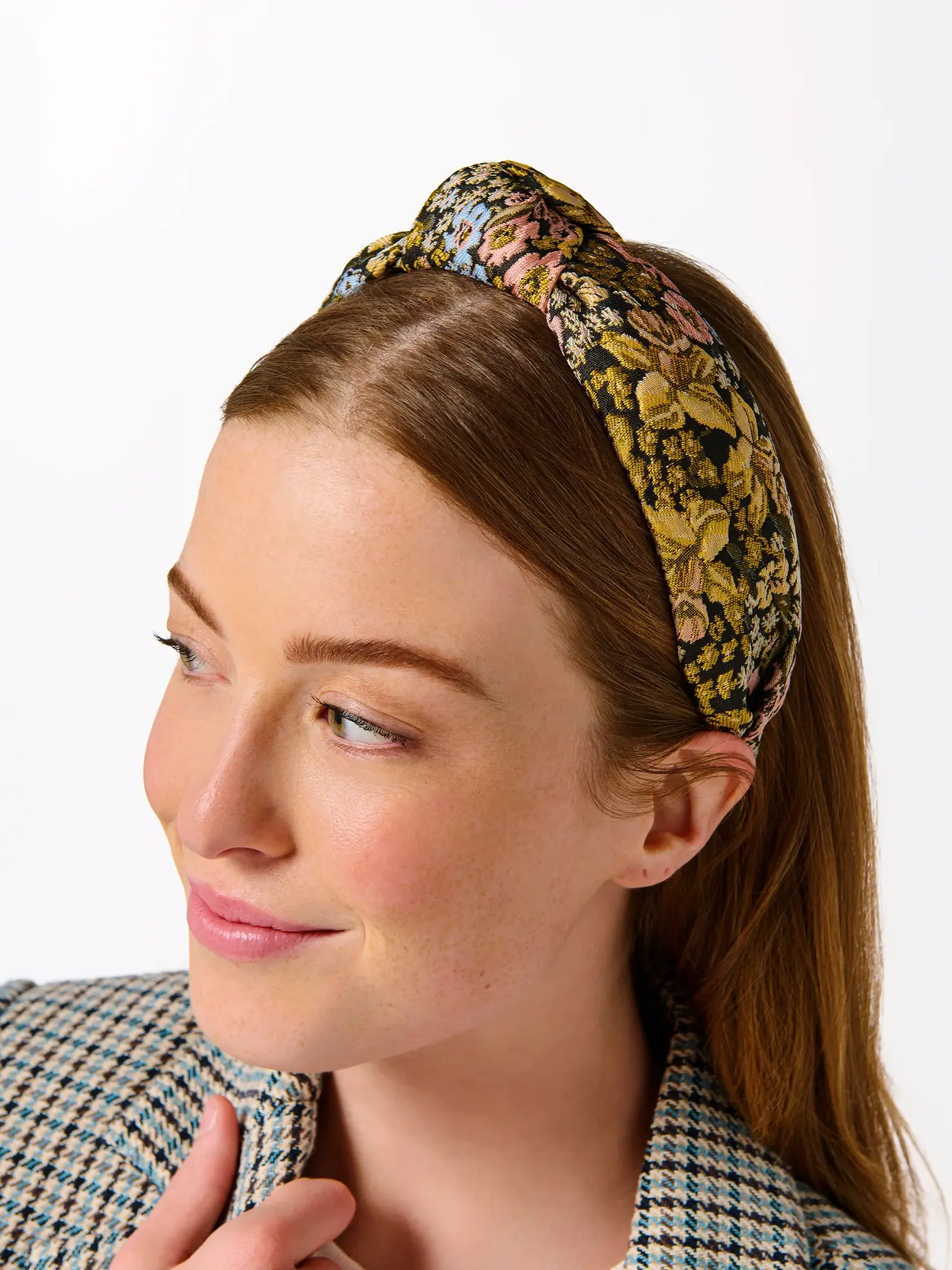 This statement piece features a luxe, textured fabric woven with a beautiful tapestry of mustard, blush, and soft blue blooms. The structured knot detail and wide band offer a flattering fit that stays comfortable from coffee runs to cocktail hour. Whether your hair’s up, down, or somewhere in between, this headband effortlessly ties your whole outfit together.
