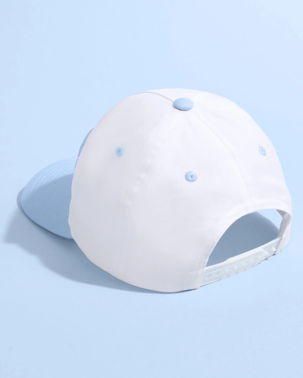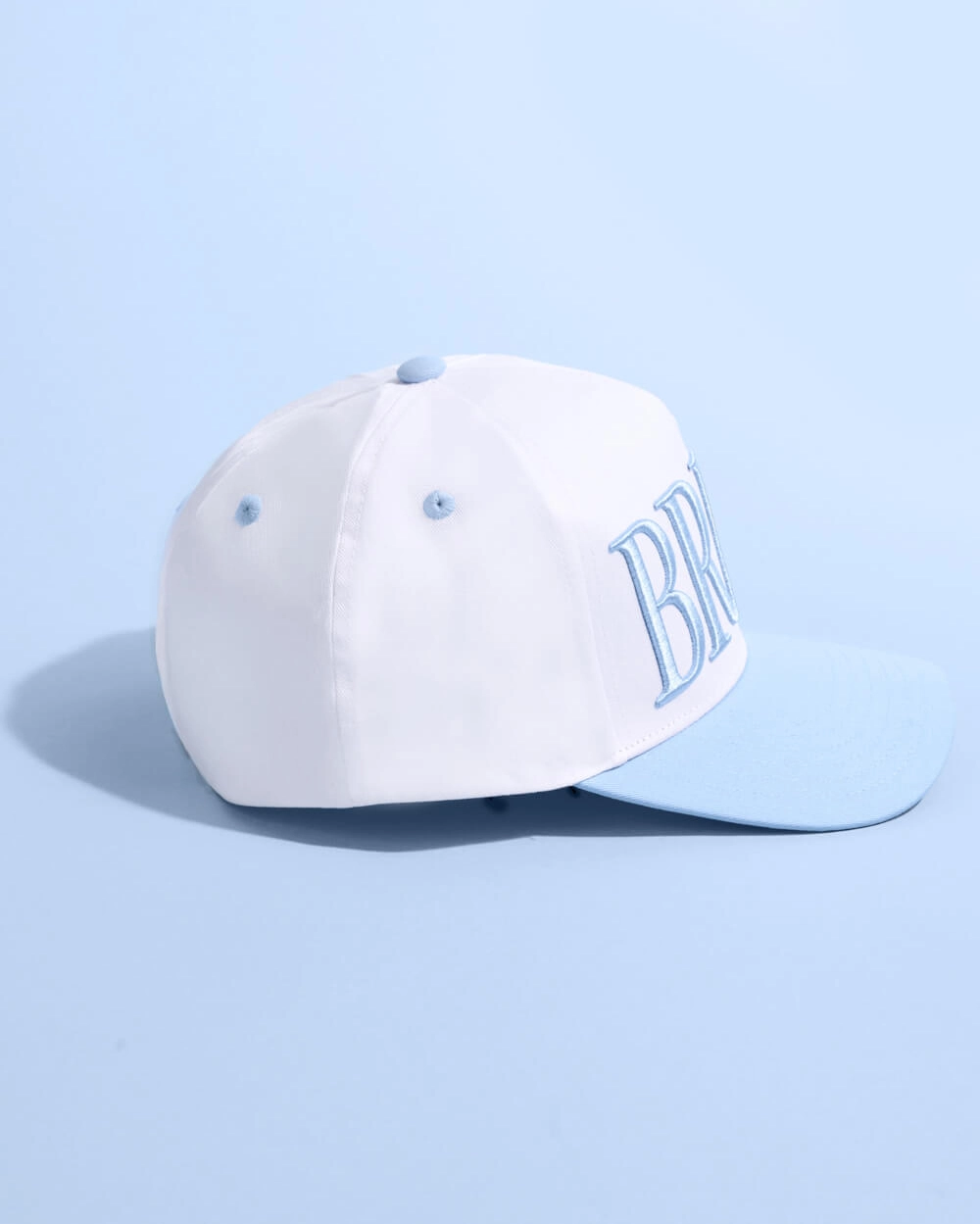 - Adjustable white and blue bride trucker hat for bachelorette weekend photos