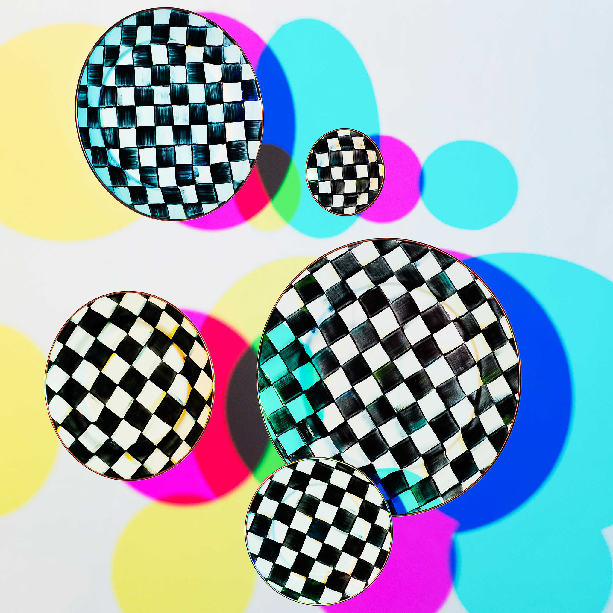 Heavy-gauge, hand-glazed steel underbody with hand-painted Courtly Checks, rimmed in bronzed stainless steel. Pieces may vary due to the handmade nature of each product. Imported.