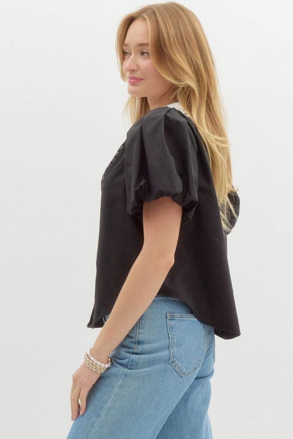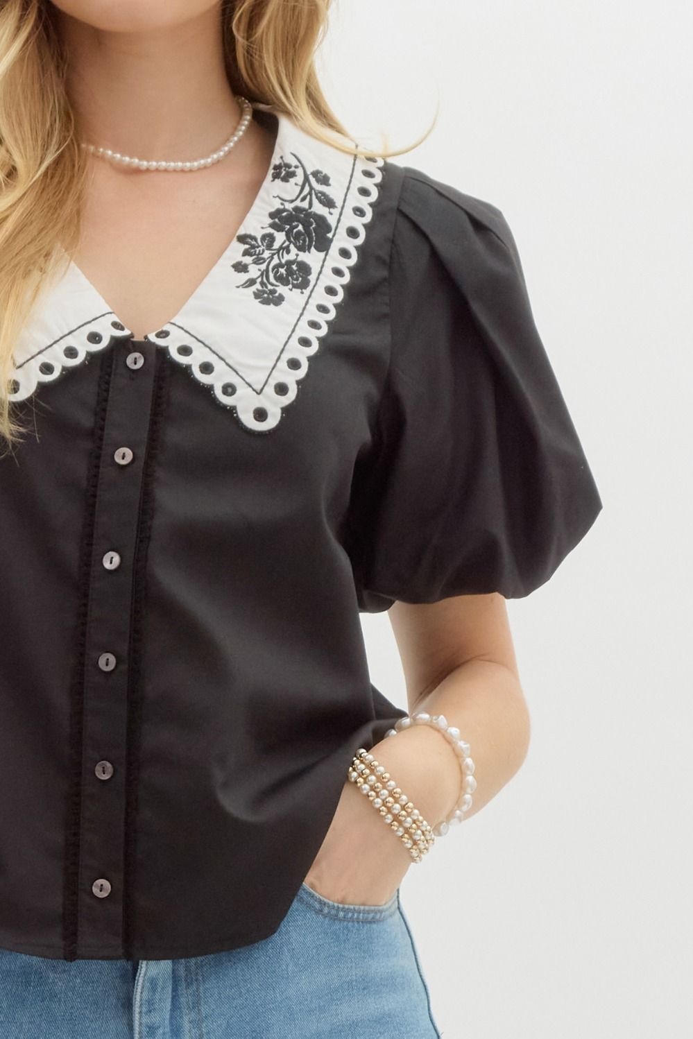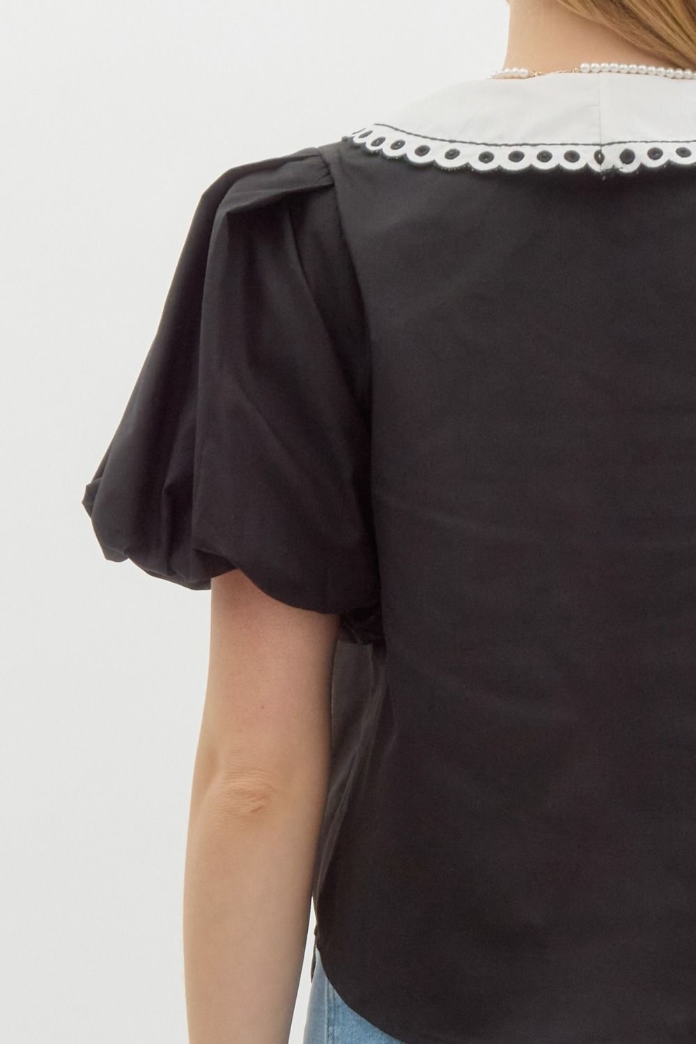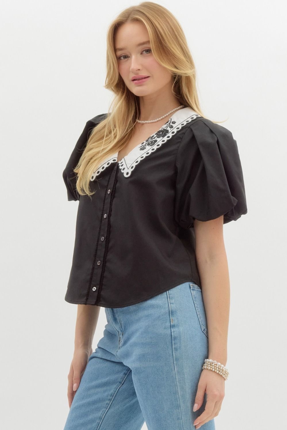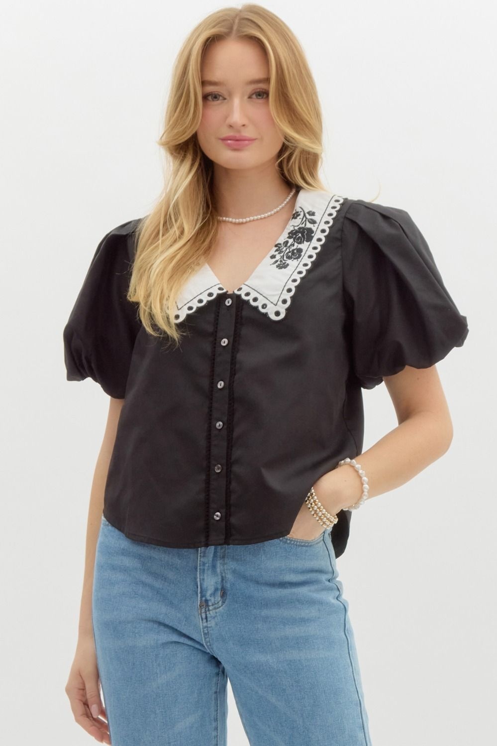- Solid poplin short bubble sleeve top featuring embroidered chelsea collar.