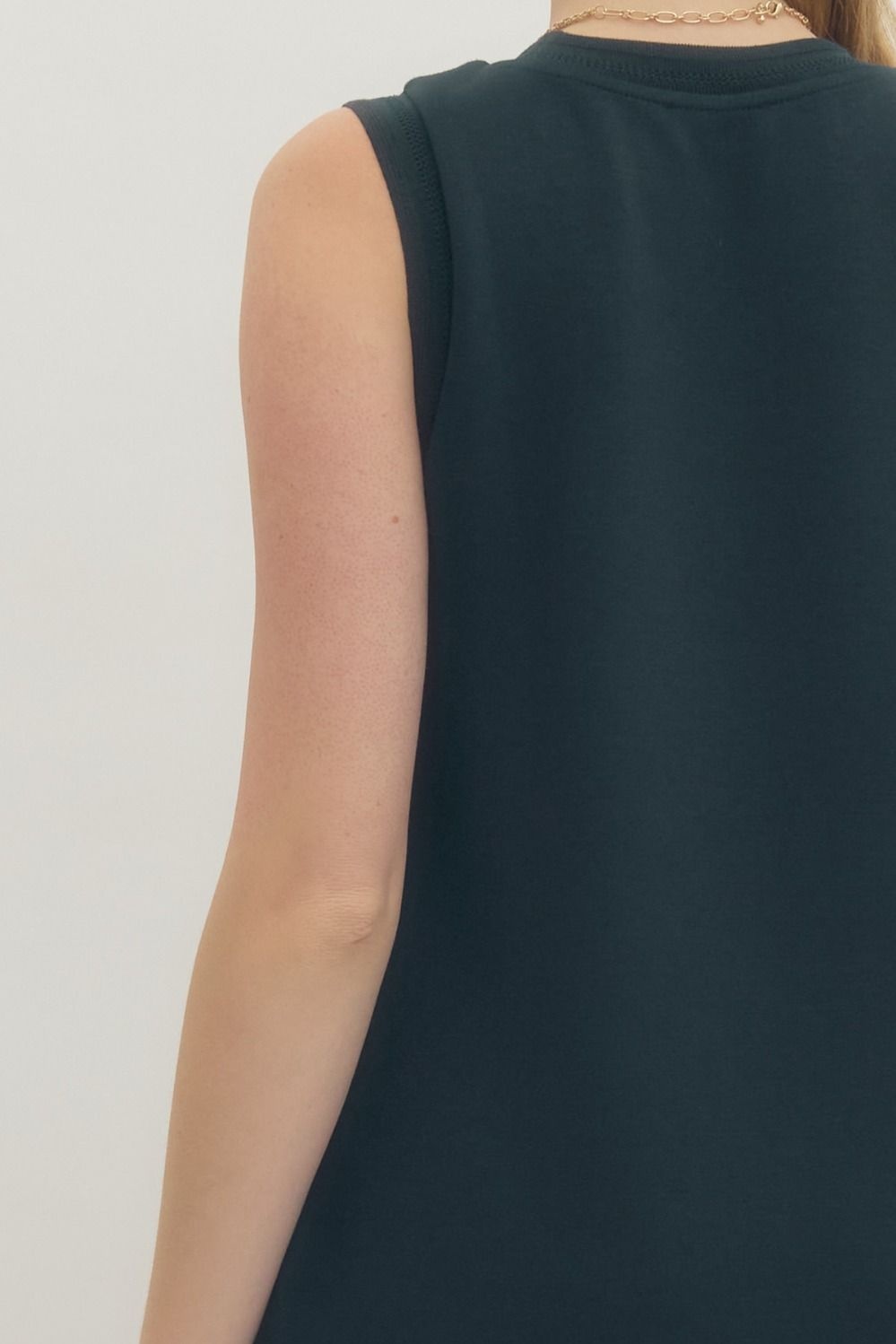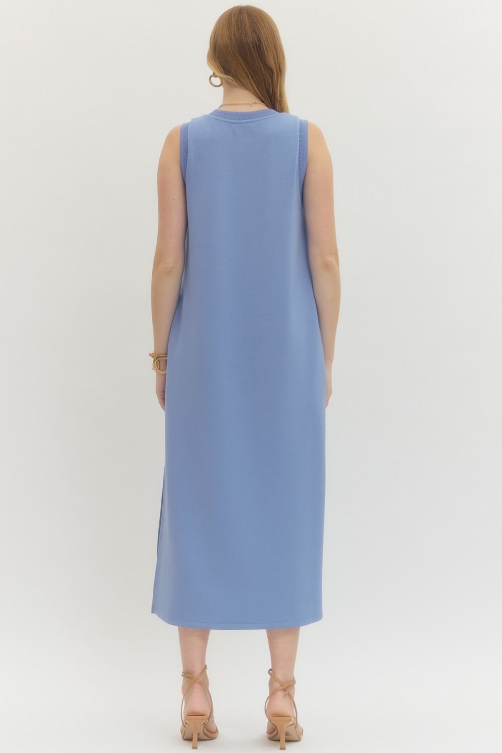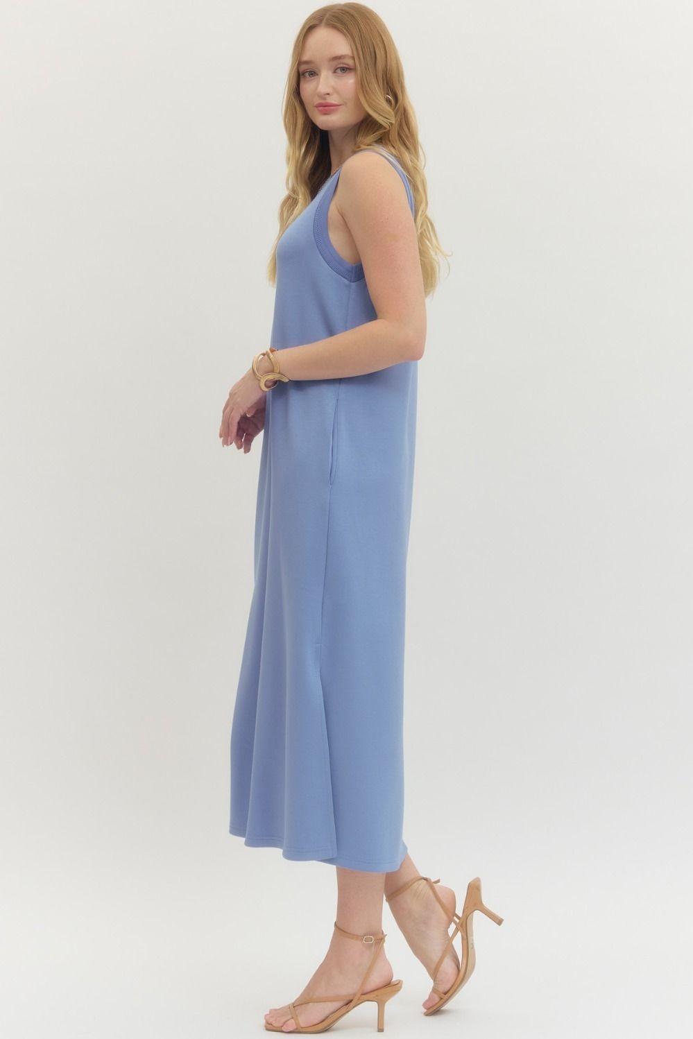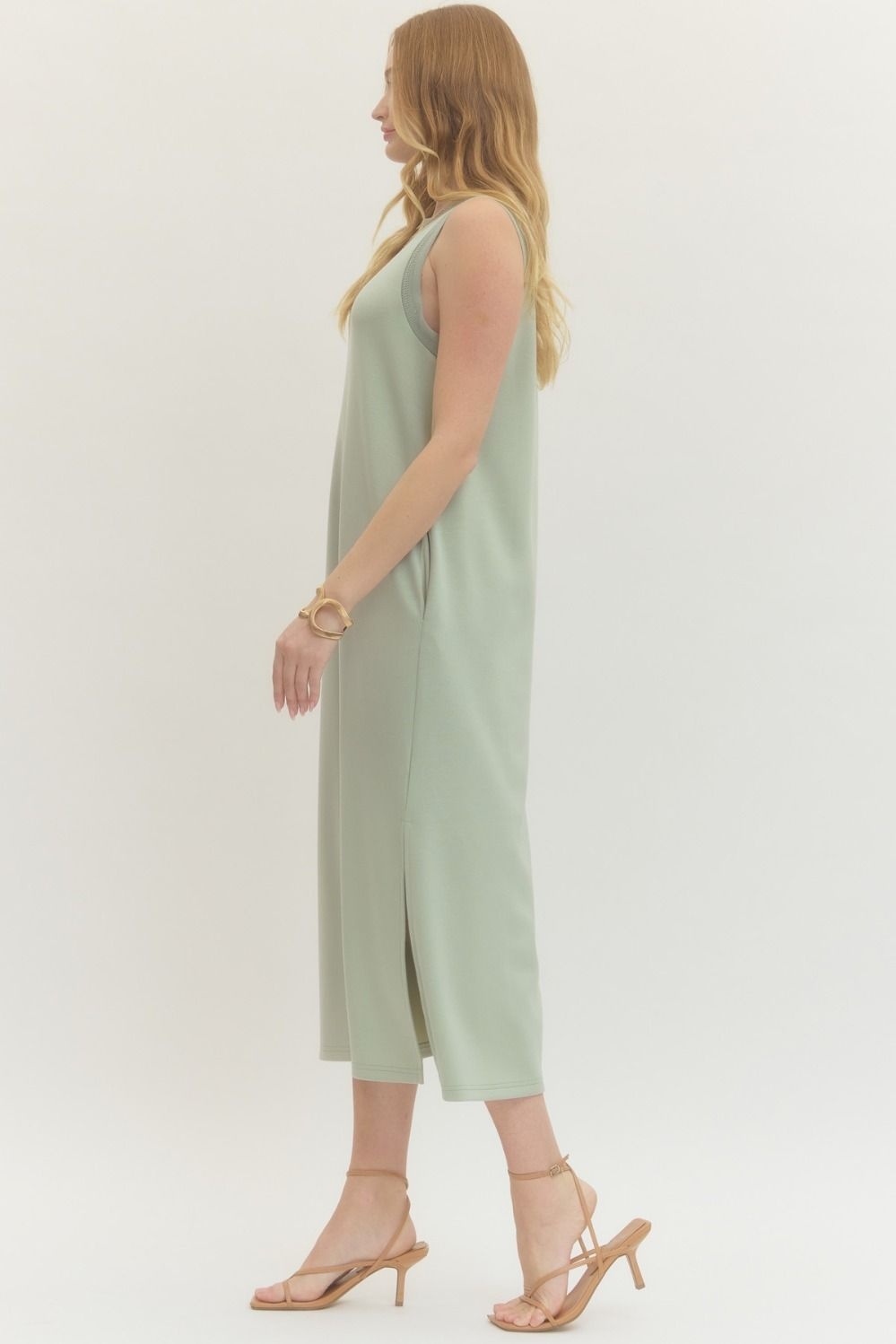 - Solid sleeveless midi dress featuring rib trim at neckline and armholes.
