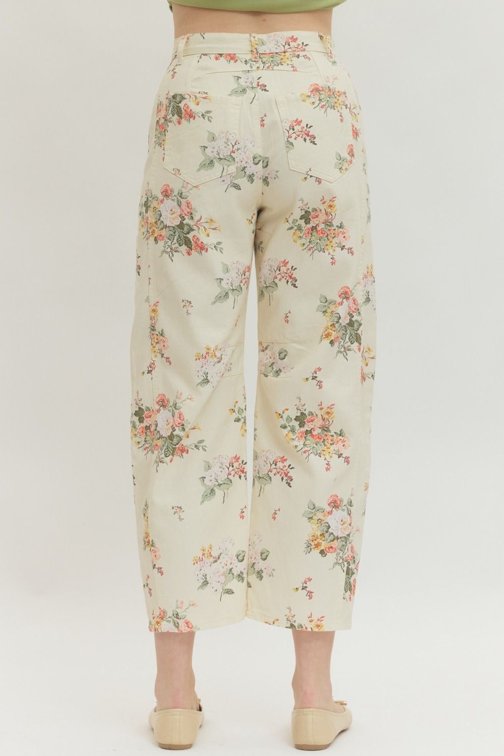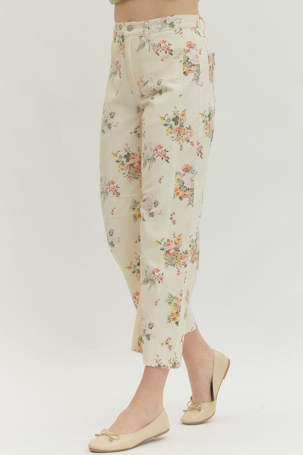 Product description100% CottonMachine wash coldImportedFloral print pants featuring zip-fly button front closure. Pocket at front and back. Unlined. Woven. Non-sheer. Lightweight.