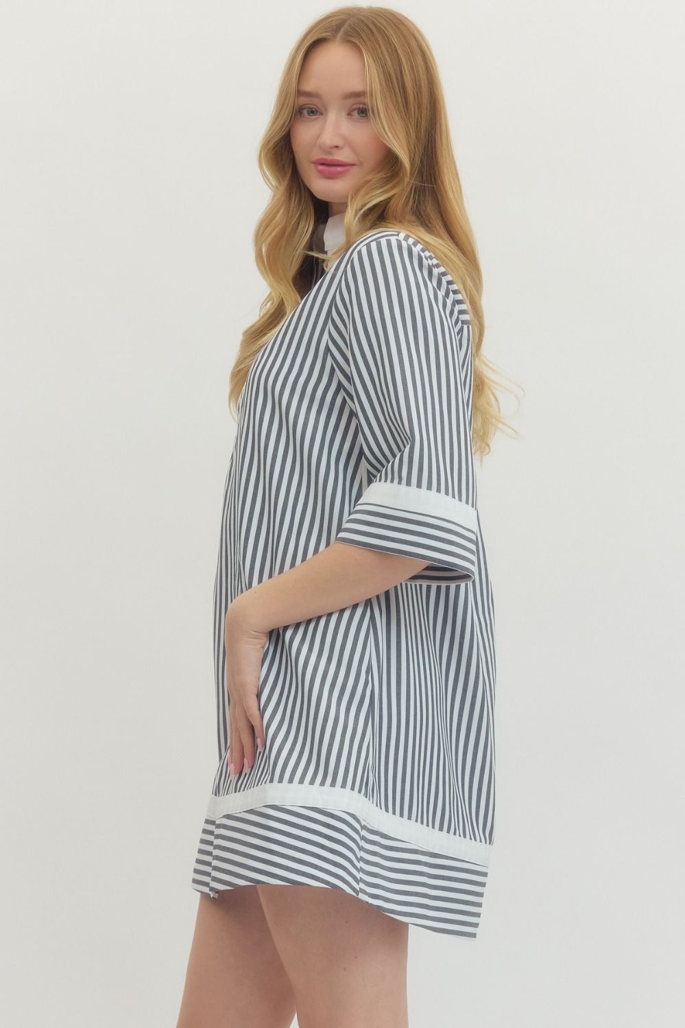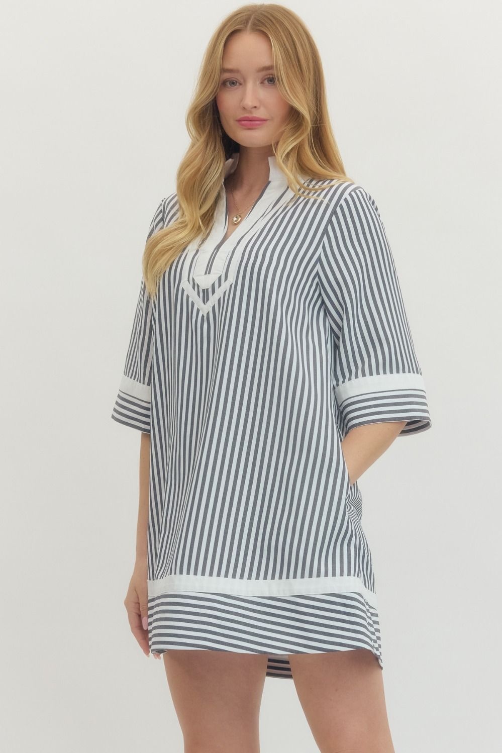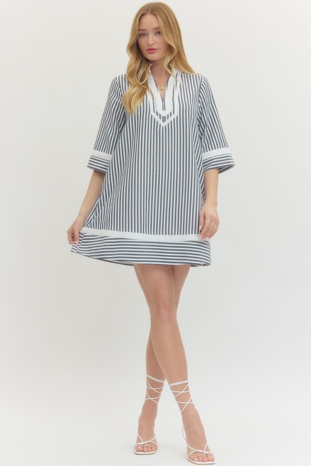 - Striped half sleeve mini dress featuring contrast trim and V-neckline.