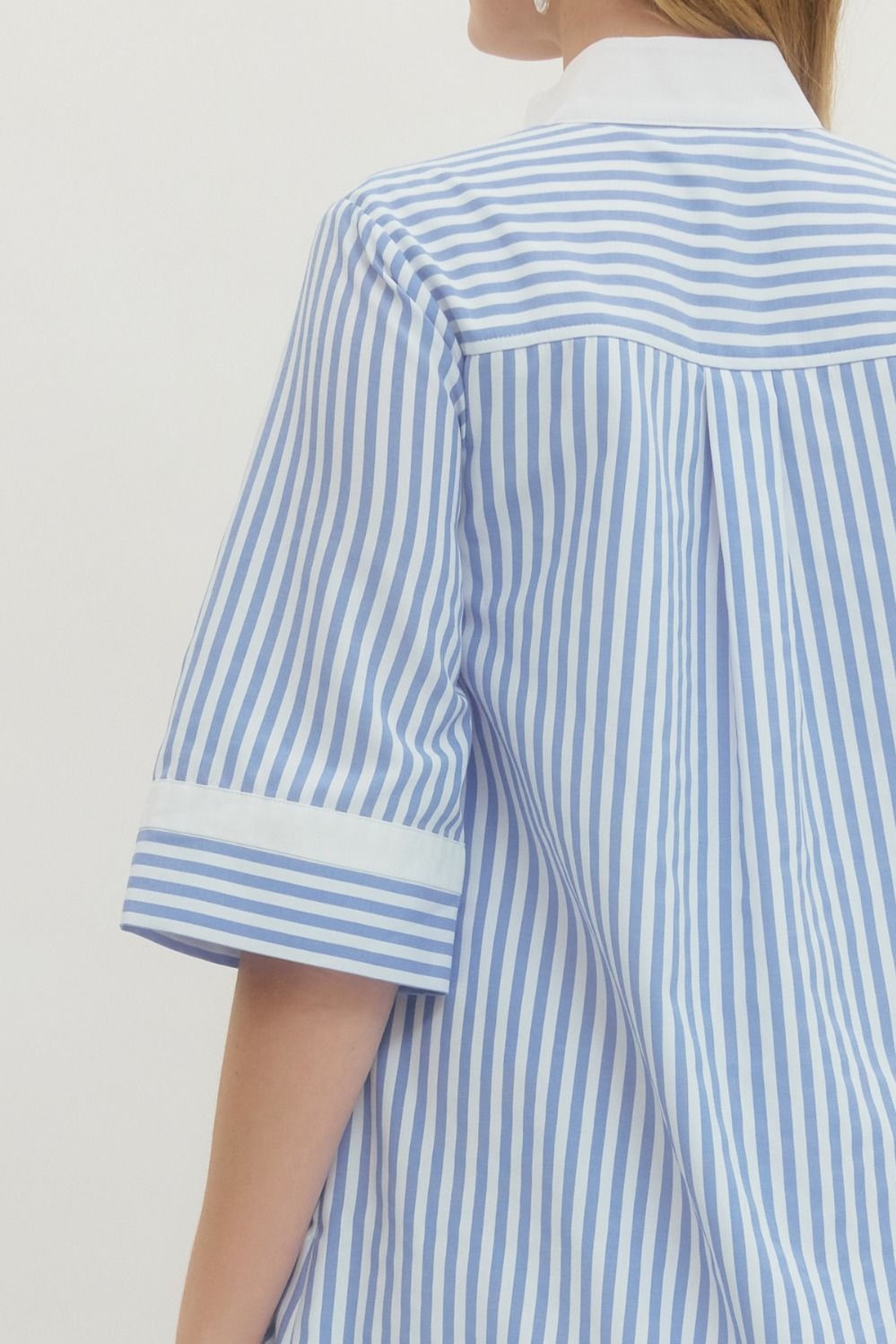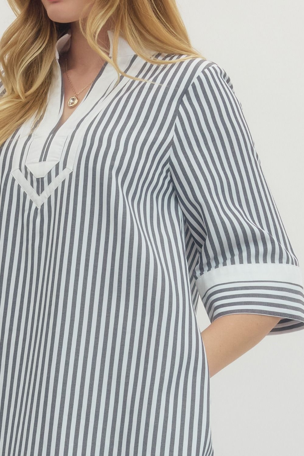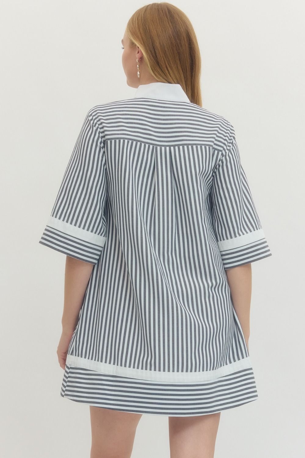 - Striped half sleeve mini dress featuring contrast trim and V-neckline.