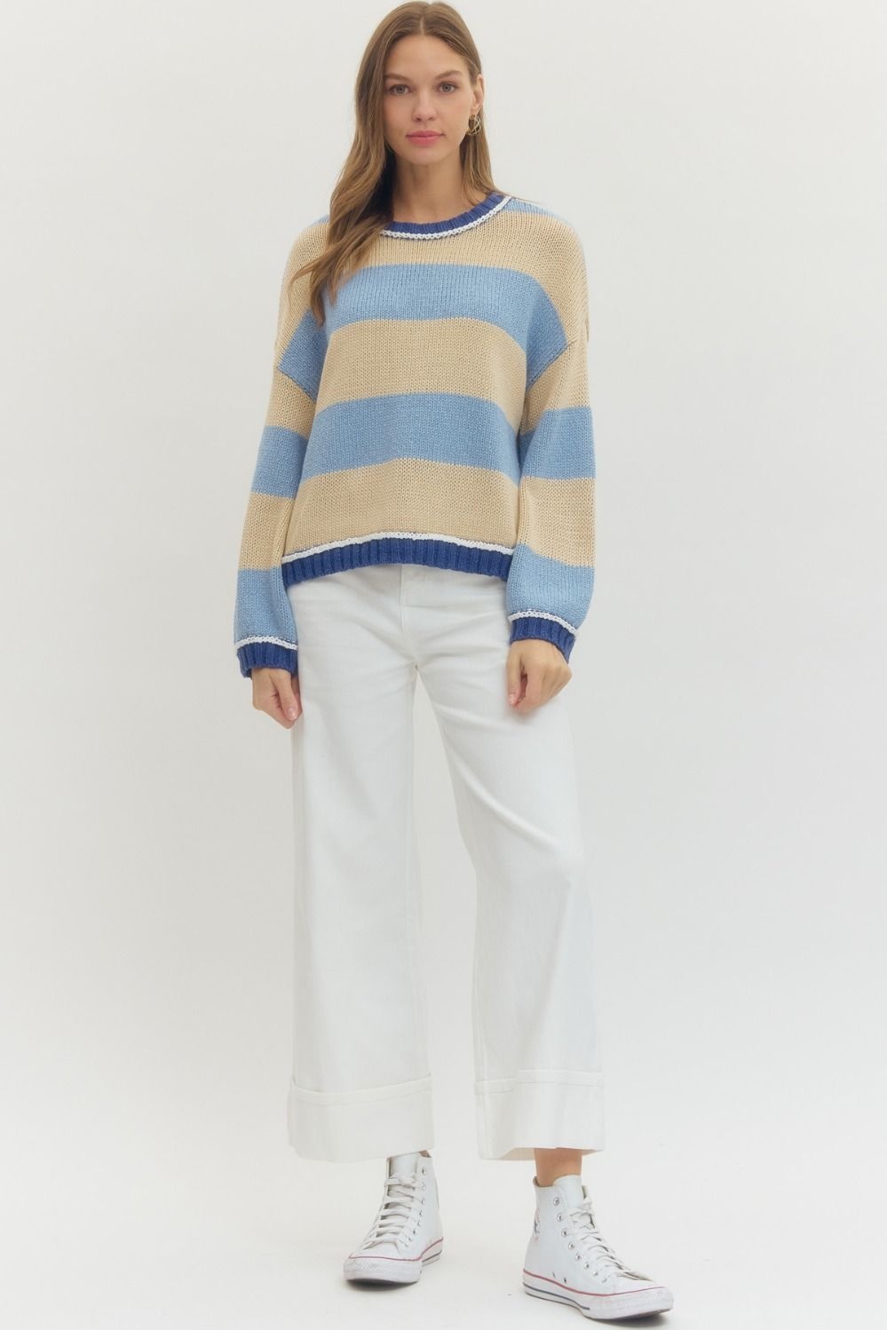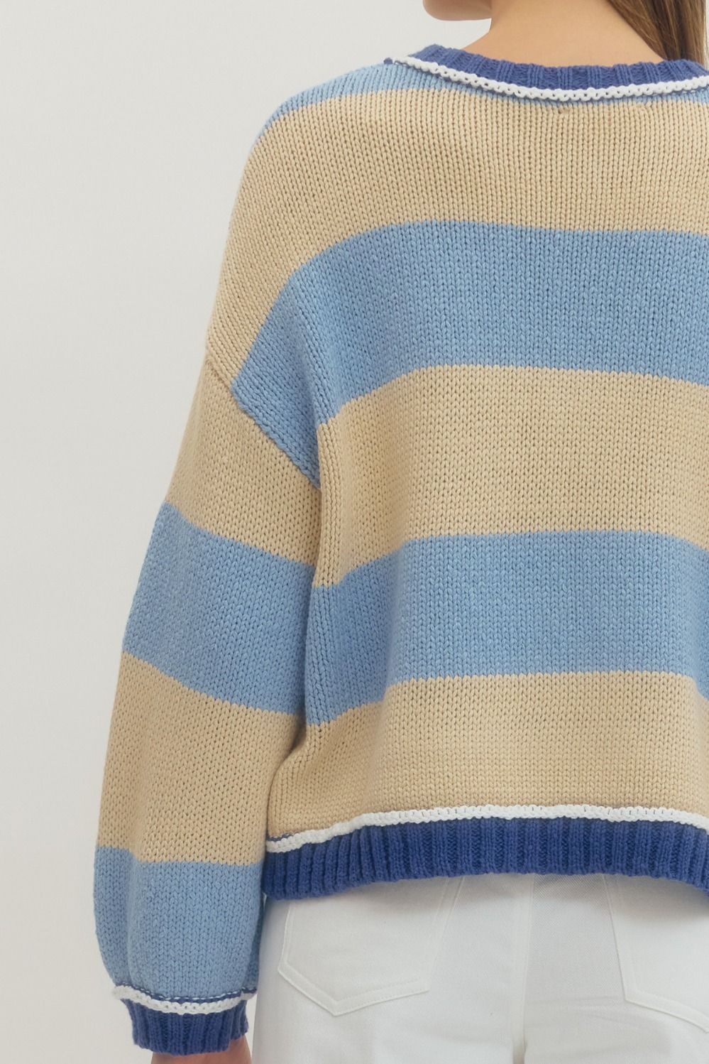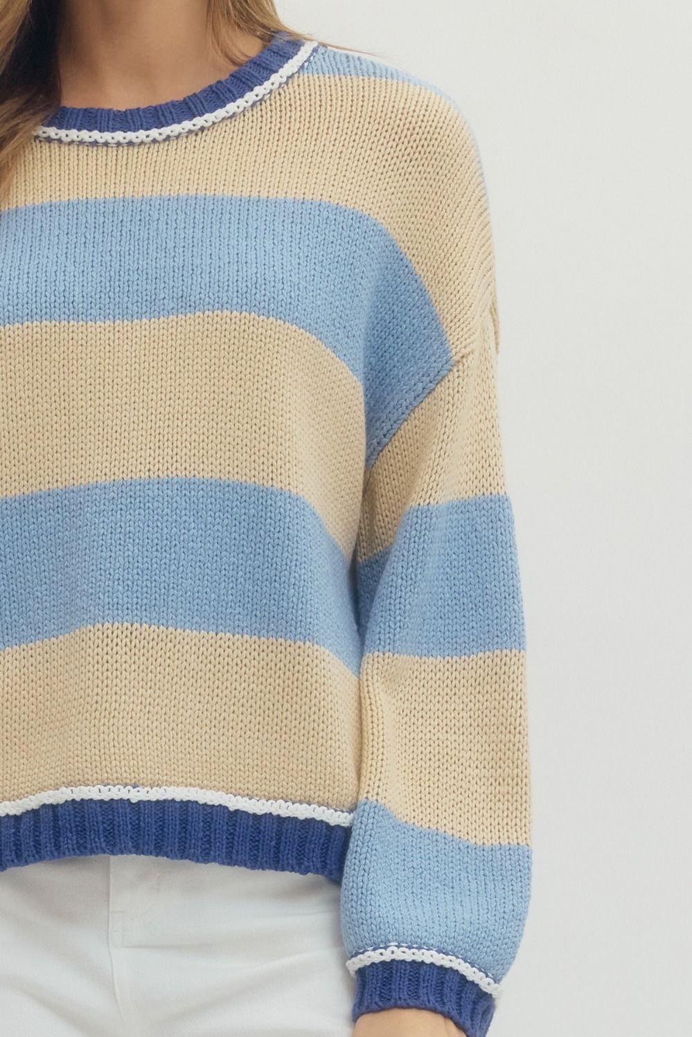 - Multicolor long sleeve knit top featuring bold stripe pattern.