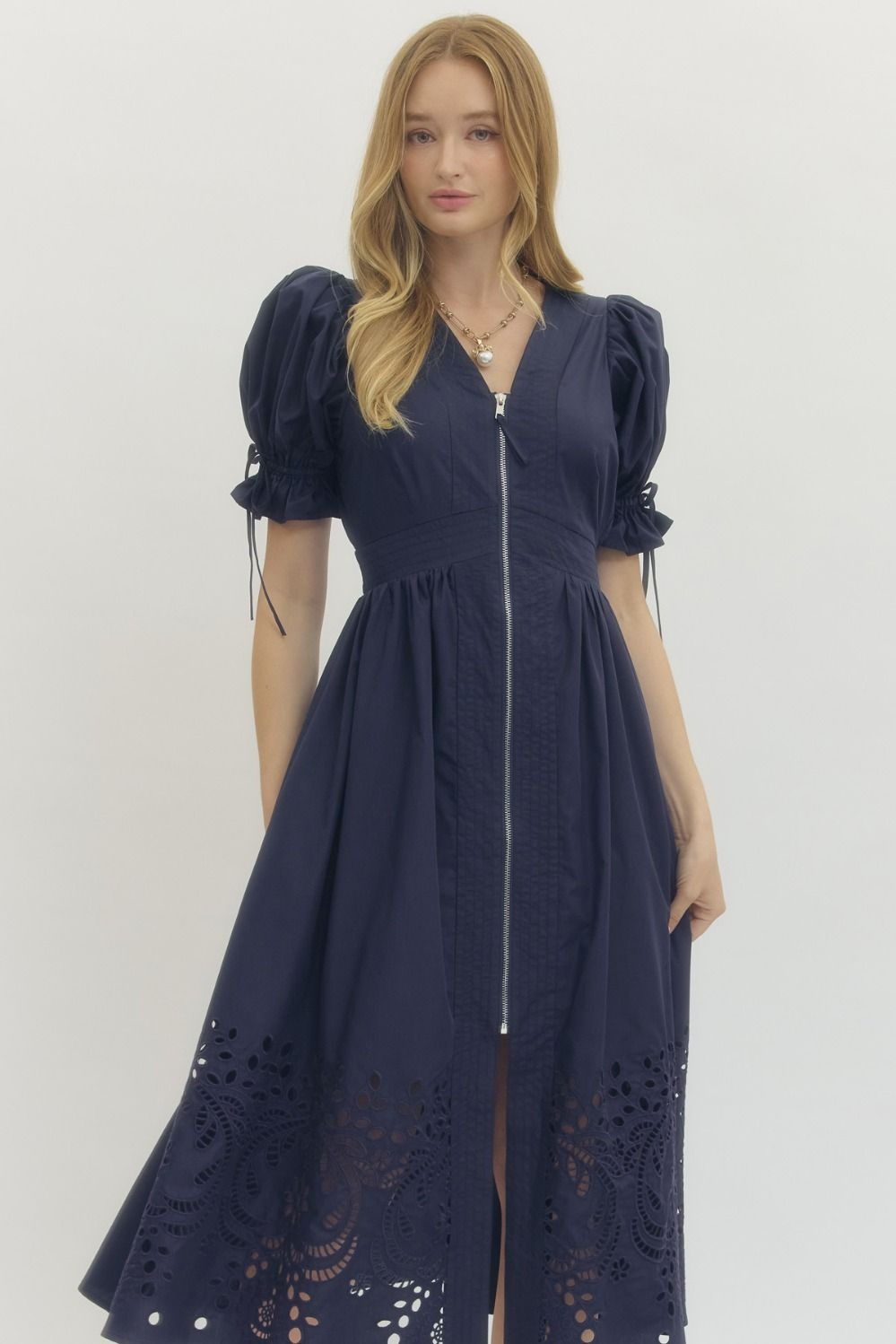 - Solid short puff sleeve midi dress featuring stitch accent V-neck and waistband and embroidered skirt hem.