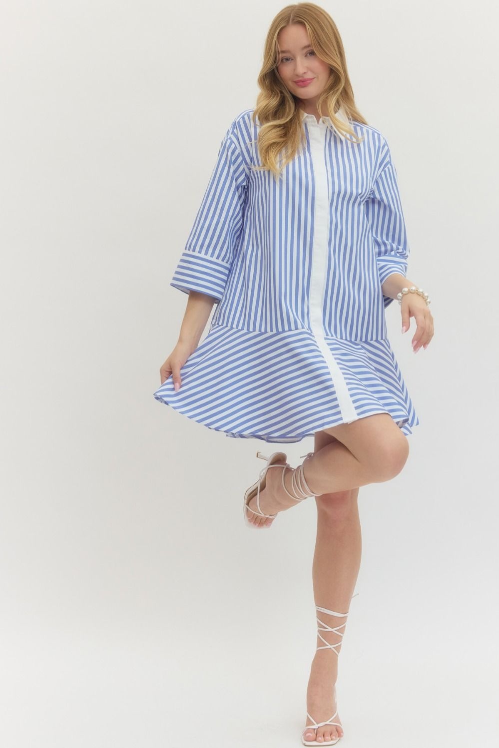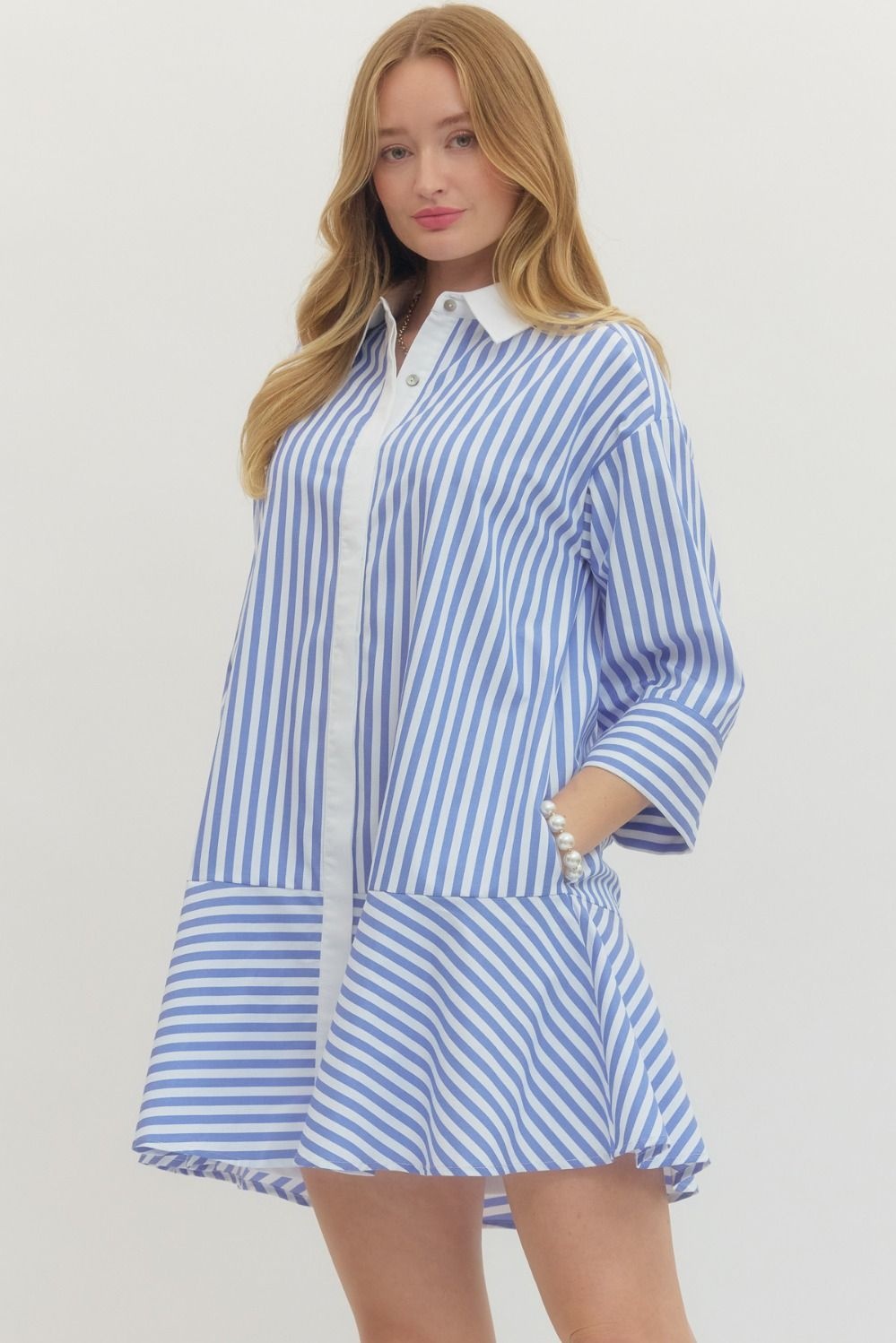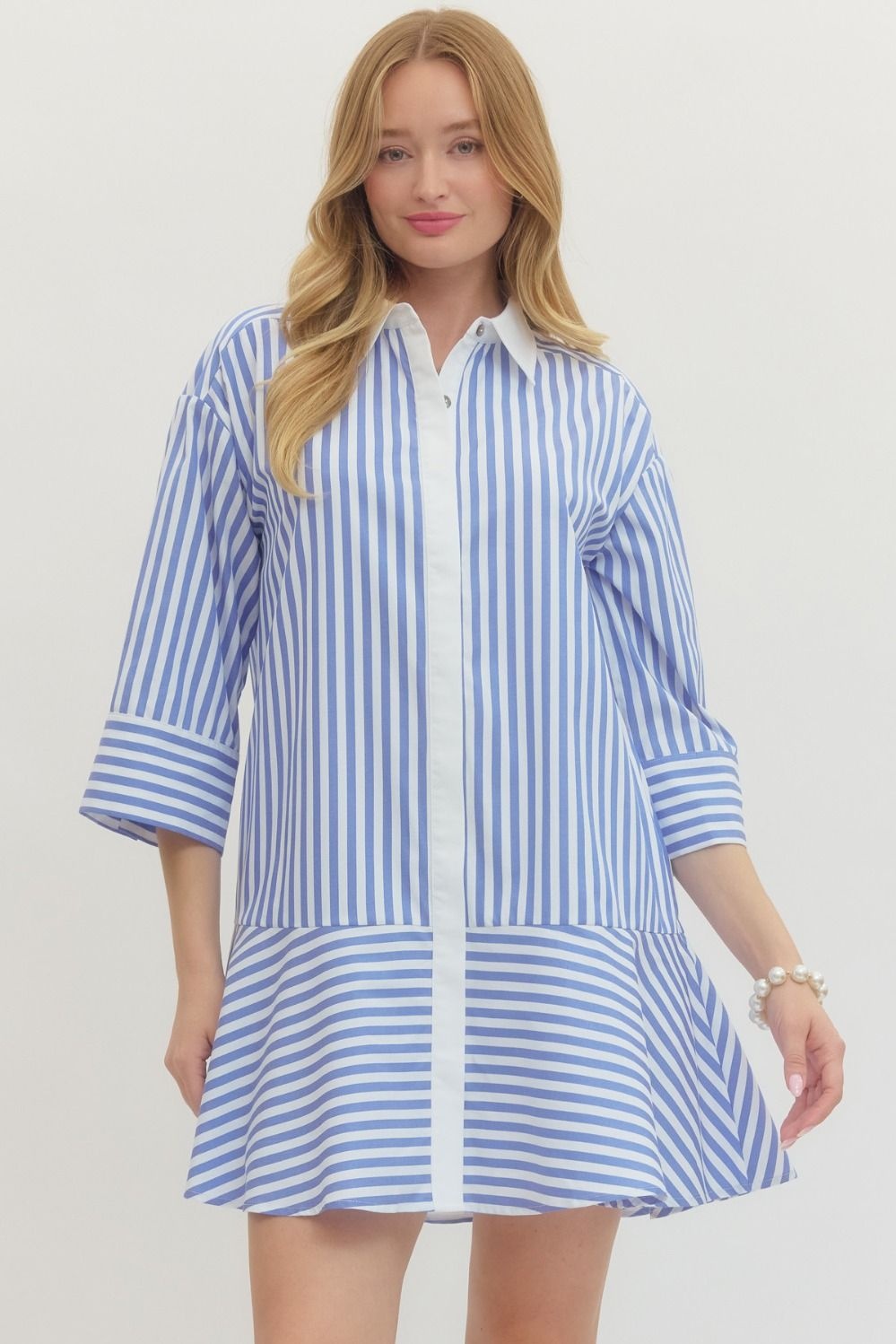 - Striped collared 3/4 sleeve mini dress featuring contrast front placket and sleeve cuffs with button detail.