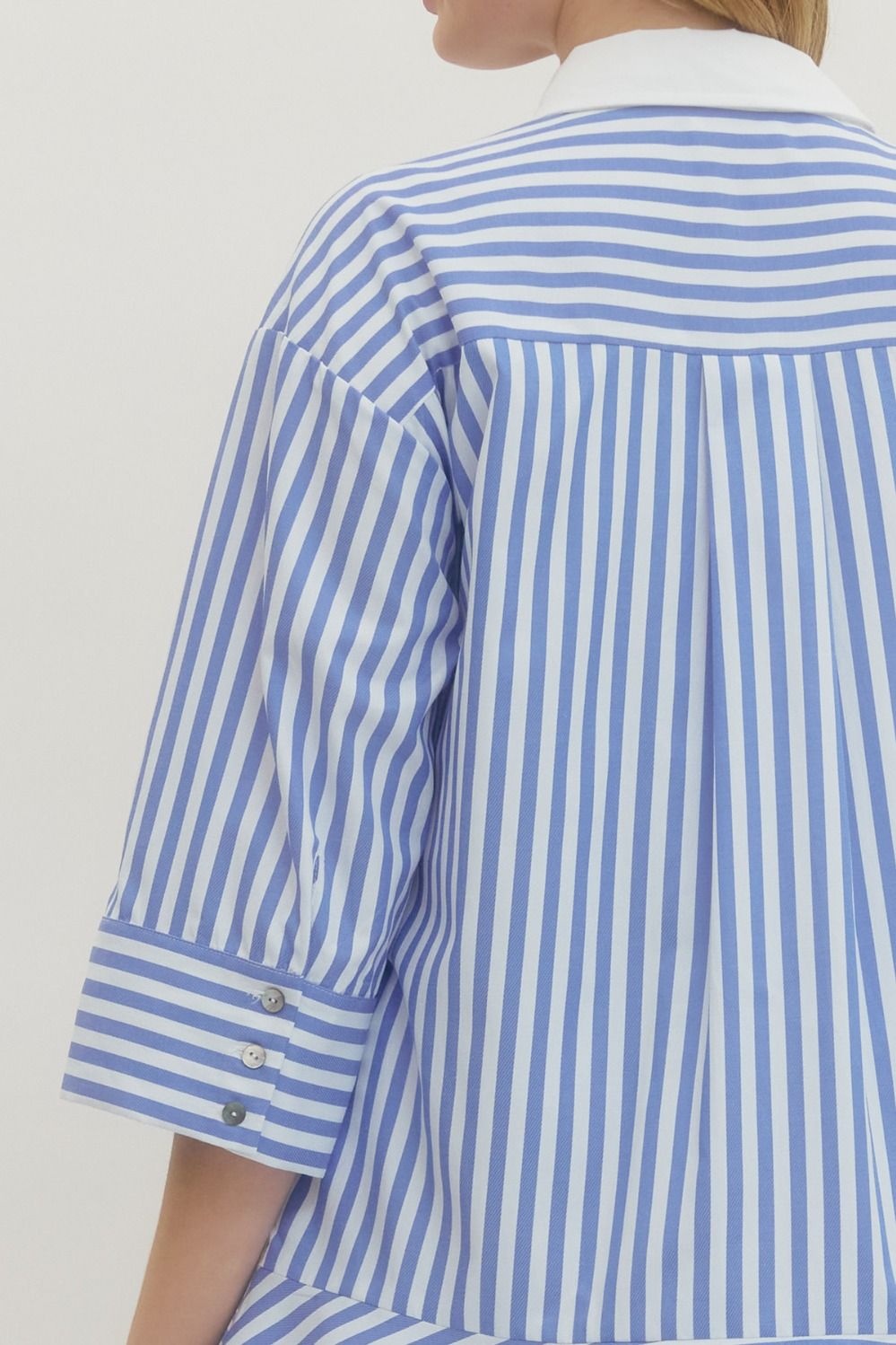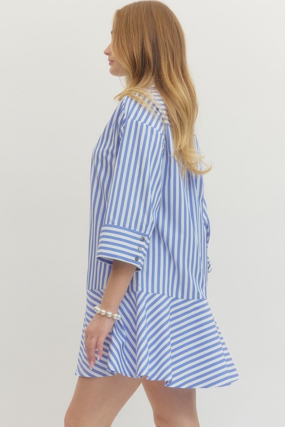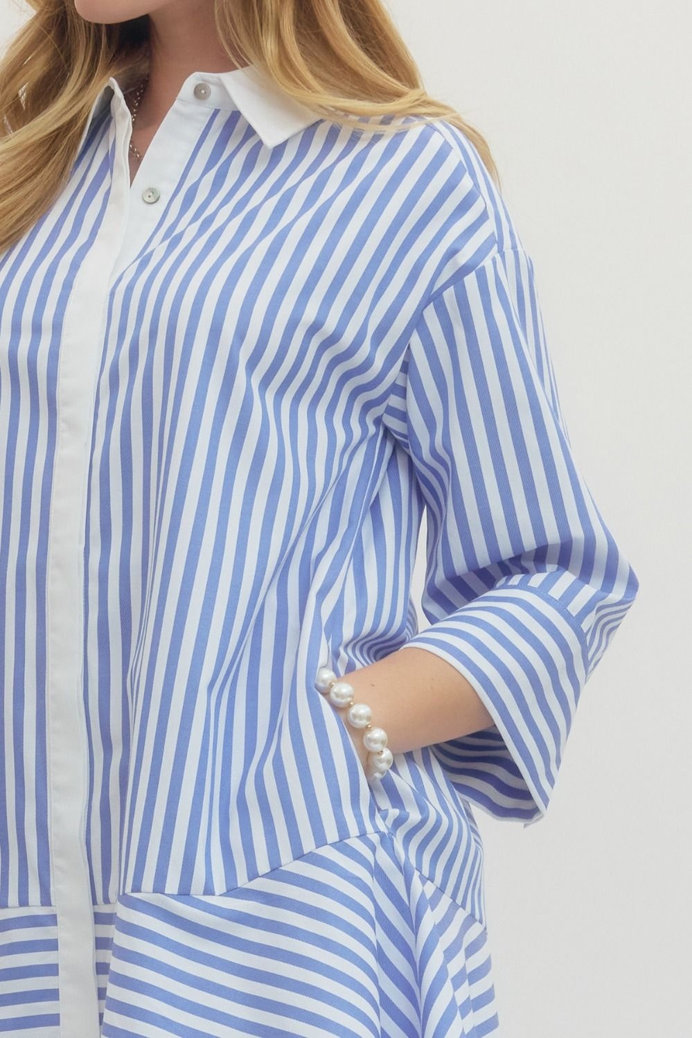 - Striped collared 3/4 sleeve mini dress featuring contrast front placket and sleeve cuffs with button detail.