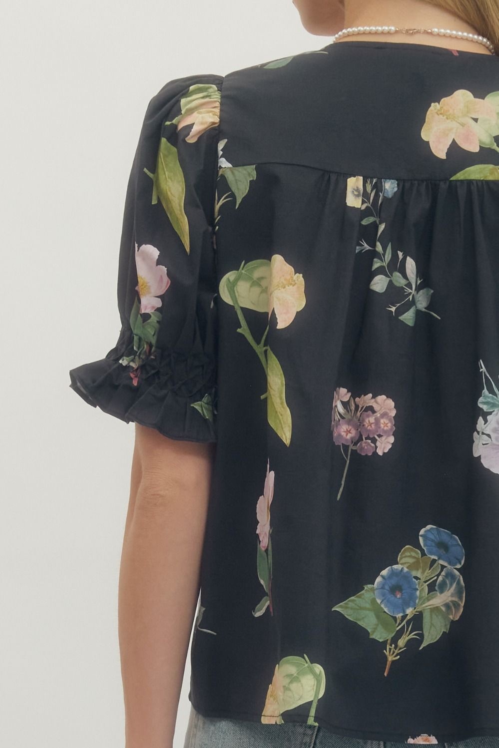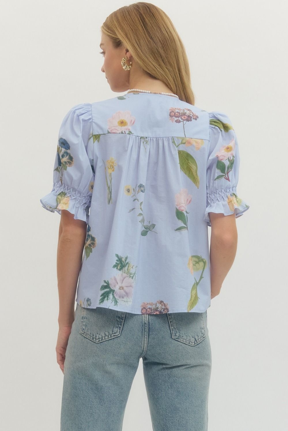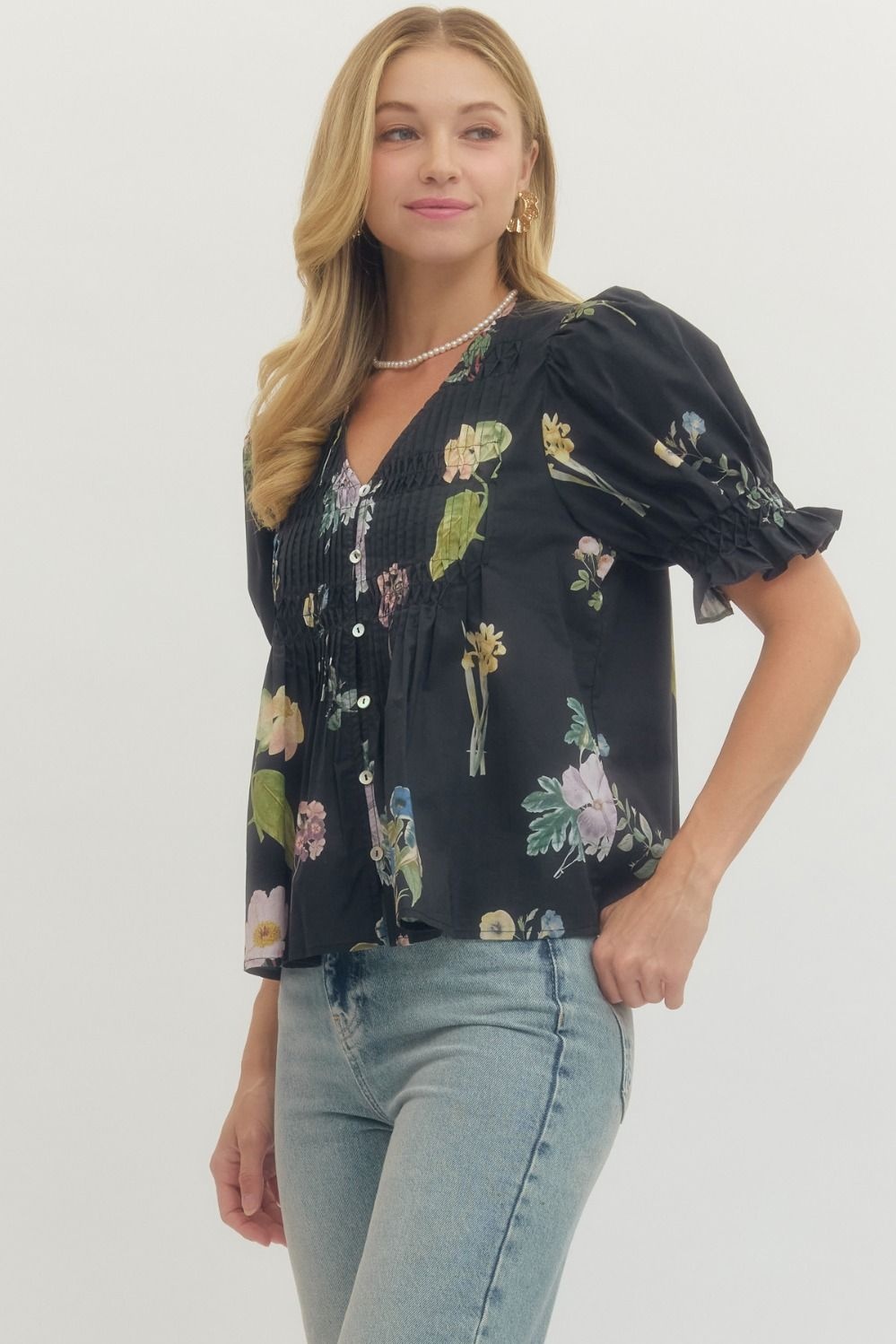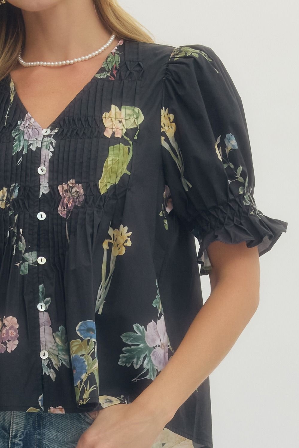 - Floral print short puff sleeve blouse featuring pintuck and smocked detail at front.