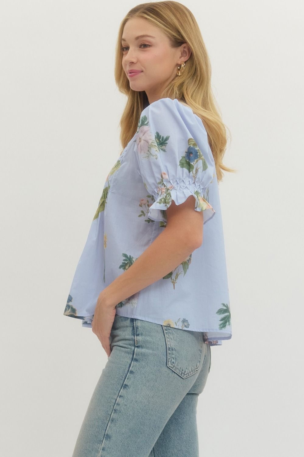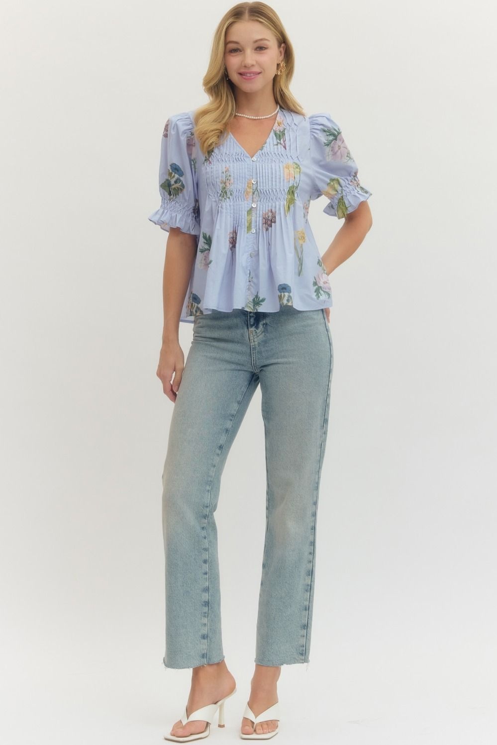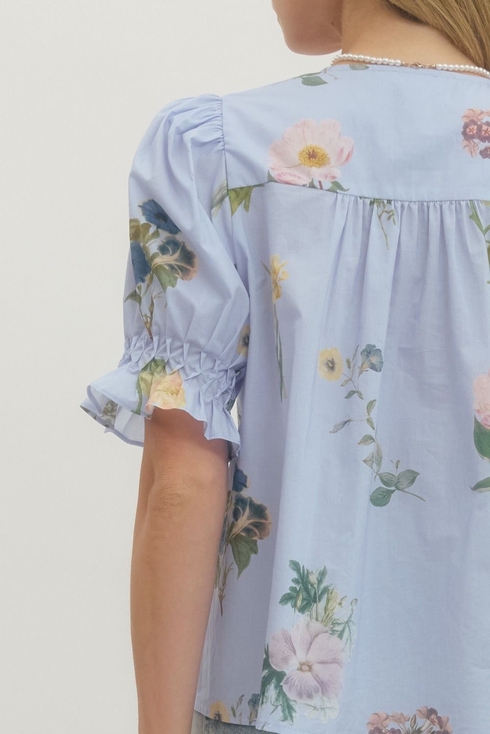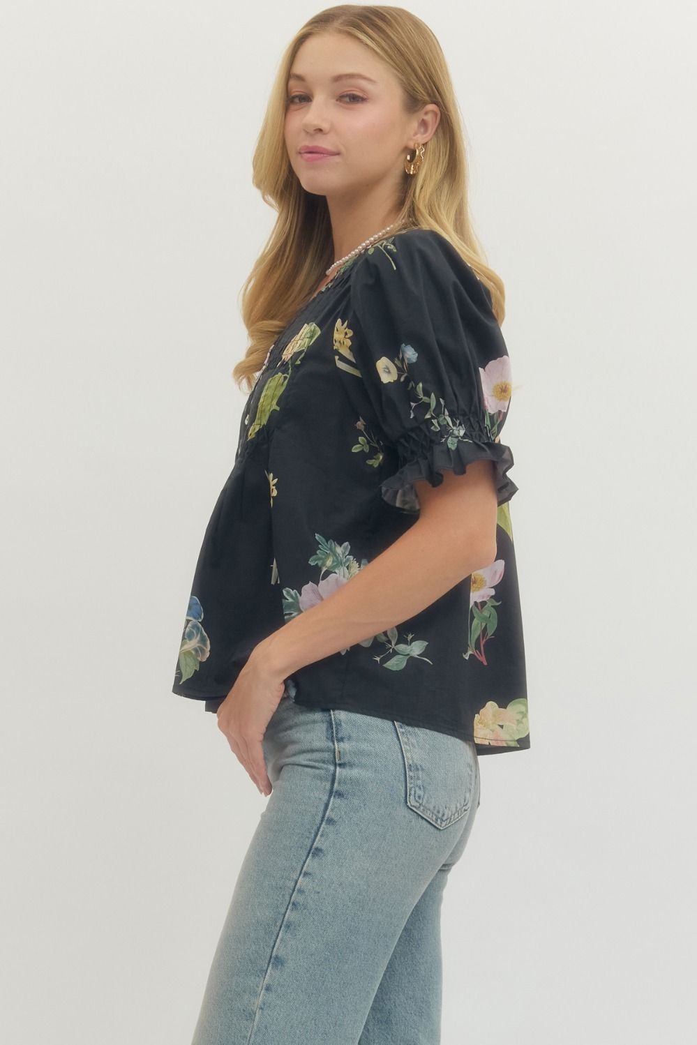 - Floral print short puff sleeve blouse featuring pintuck and smocked detail at front.