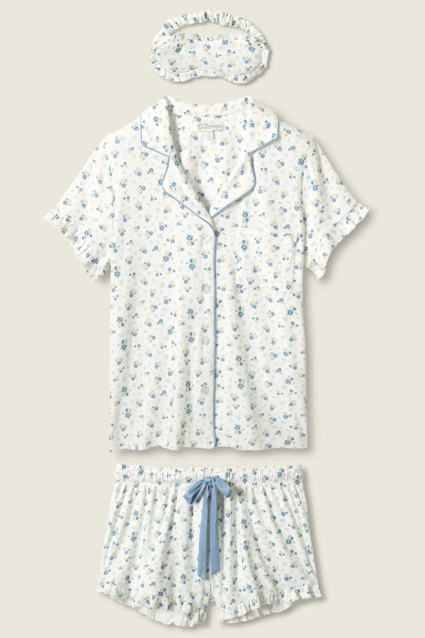 PJ SalvageMore Amour PJ Set -(0) $125.00 Excl. tax In stock (1) Make a choiceSize : XSSize : SSize : MSize : LSize : XLSize: *XSSMLXLAvailable in store:Check availabilityAdd to cartLogin for wishlistQuick OrderFree shipping From $200.00DescriptionShareSoft ivory florals meet delicate ruffles in this dreamy three-piece pajama set. Crafted from double-brushed pointelle that’s smooth and lightly textured, it includes a short-sleeve button-down top, ruffled shorts with a blue drawstring. Facebook Pin it WhatsappAdd to comparison list