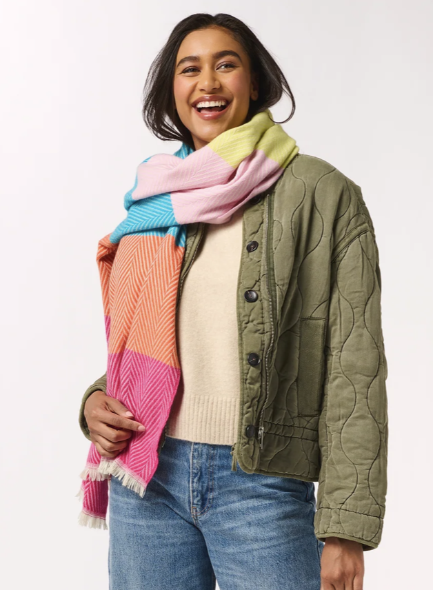 Its oversized silhouette makes it perfect for bundling up, wrapping, or draping with flair. Finished with a delicate raw hem, it brings cheerful vibes to even the chilliest of days. Available in multi (photo 1) and navy (photo 3).