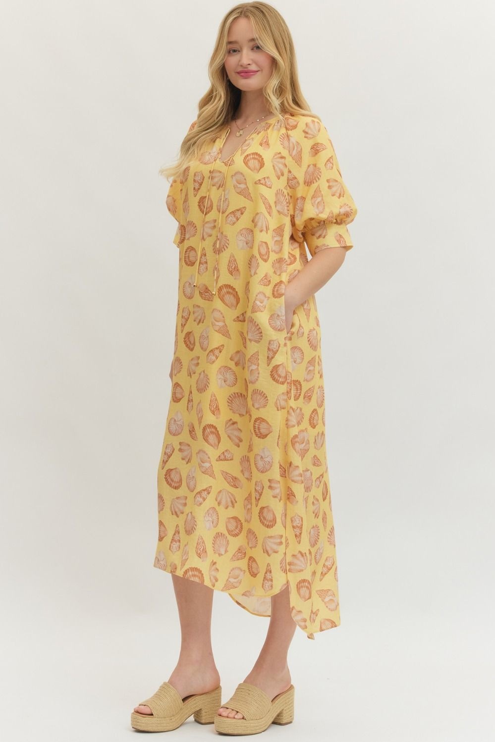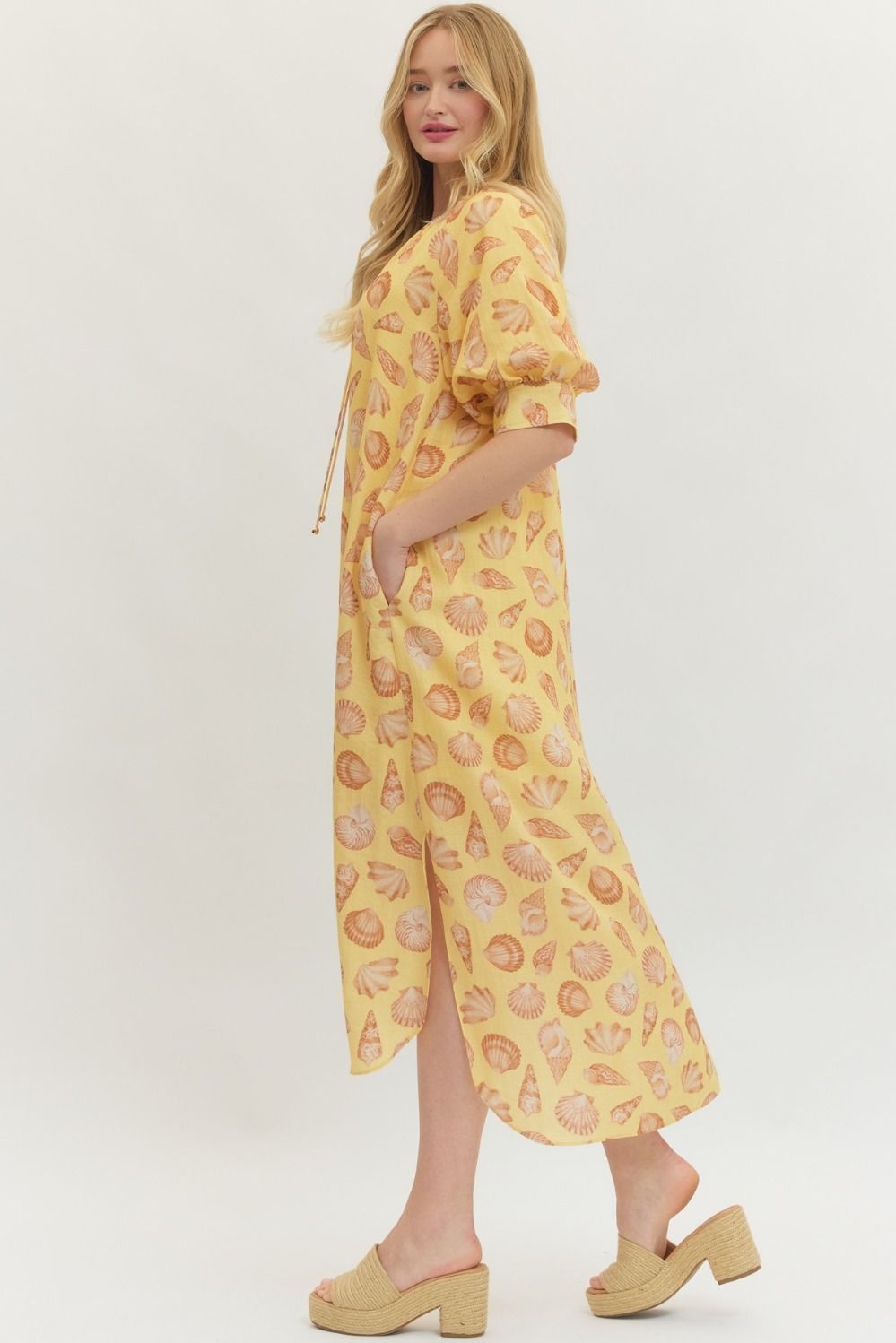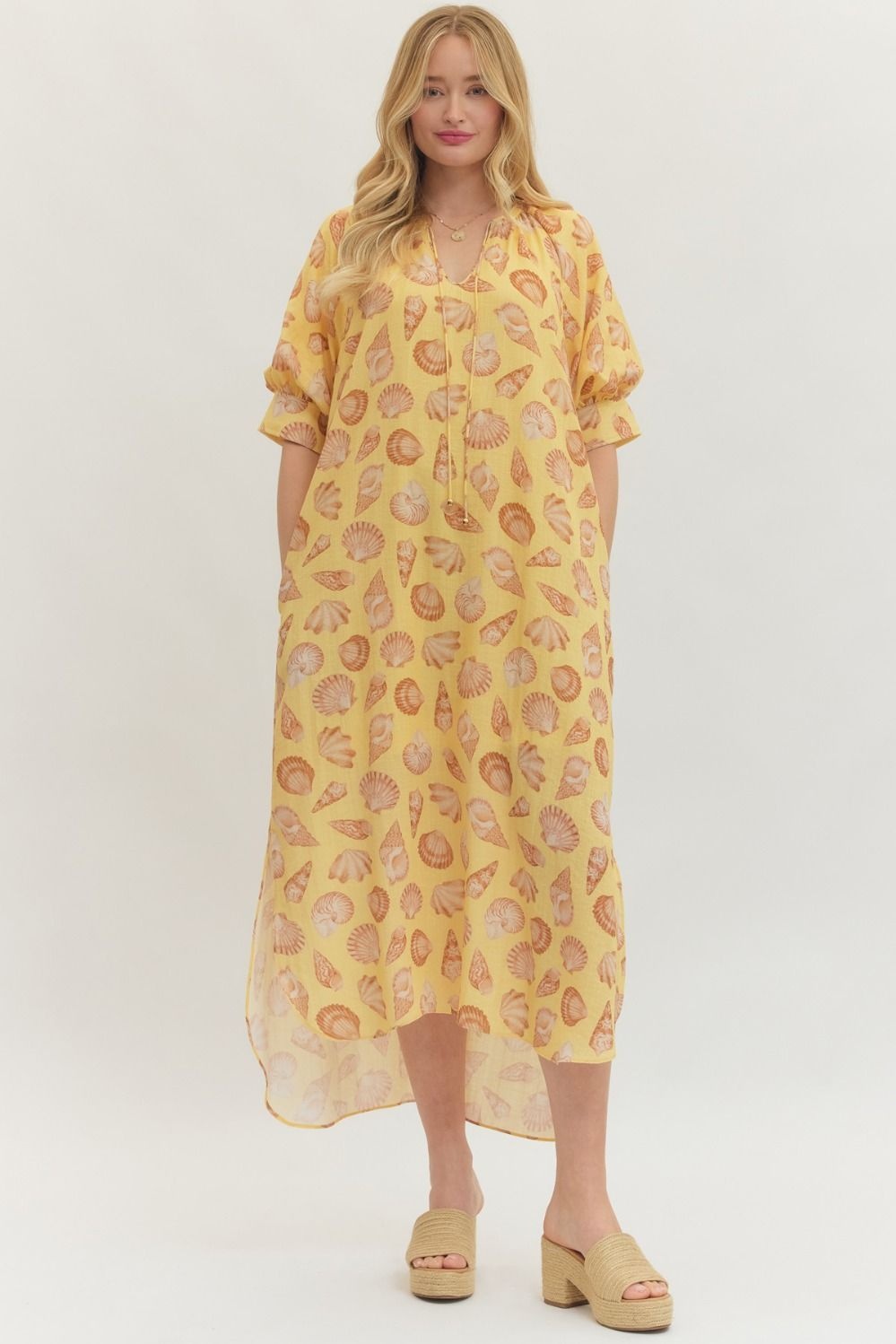 - Shell print short sleeve midi dress featuring tie neckline with tassel detail.