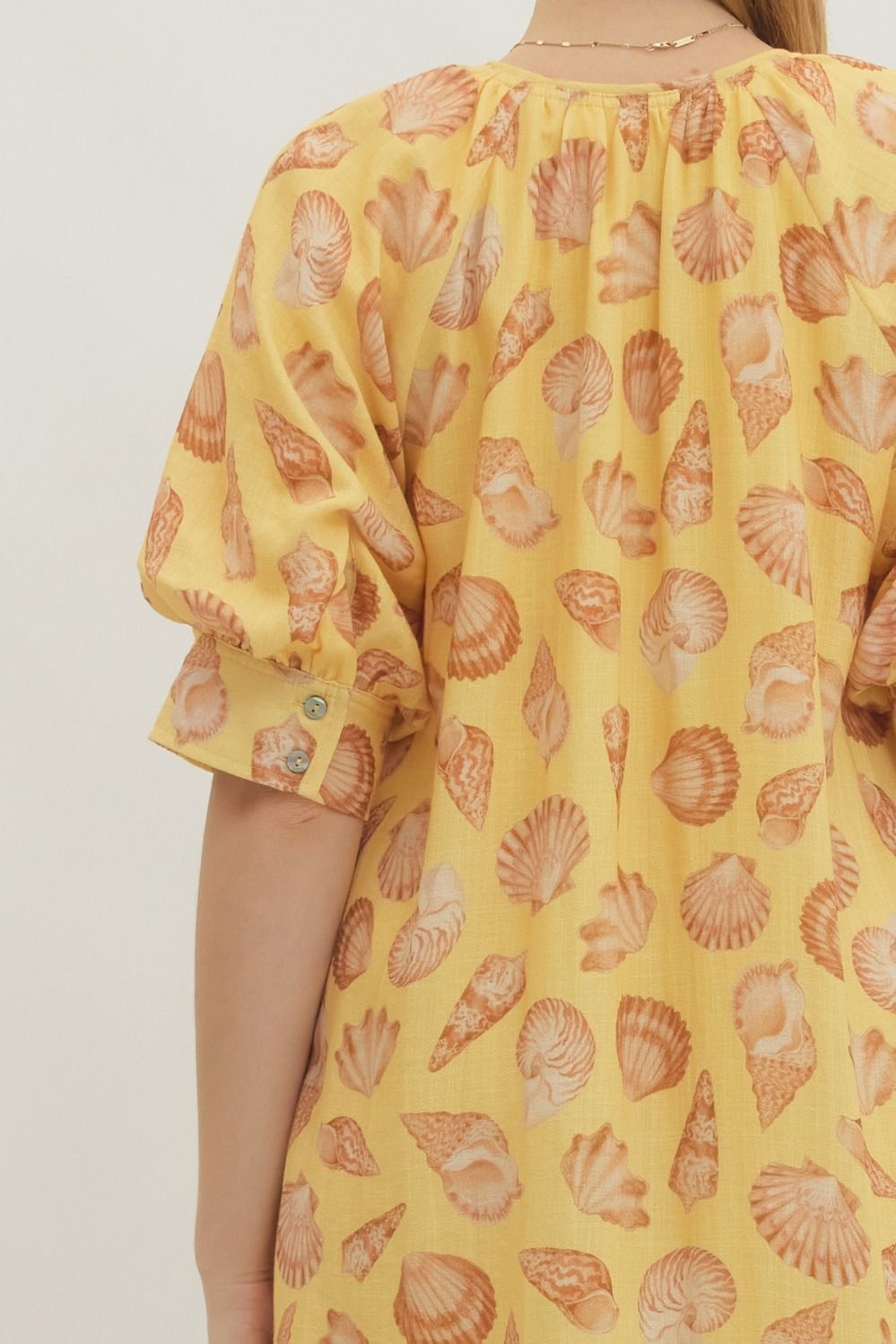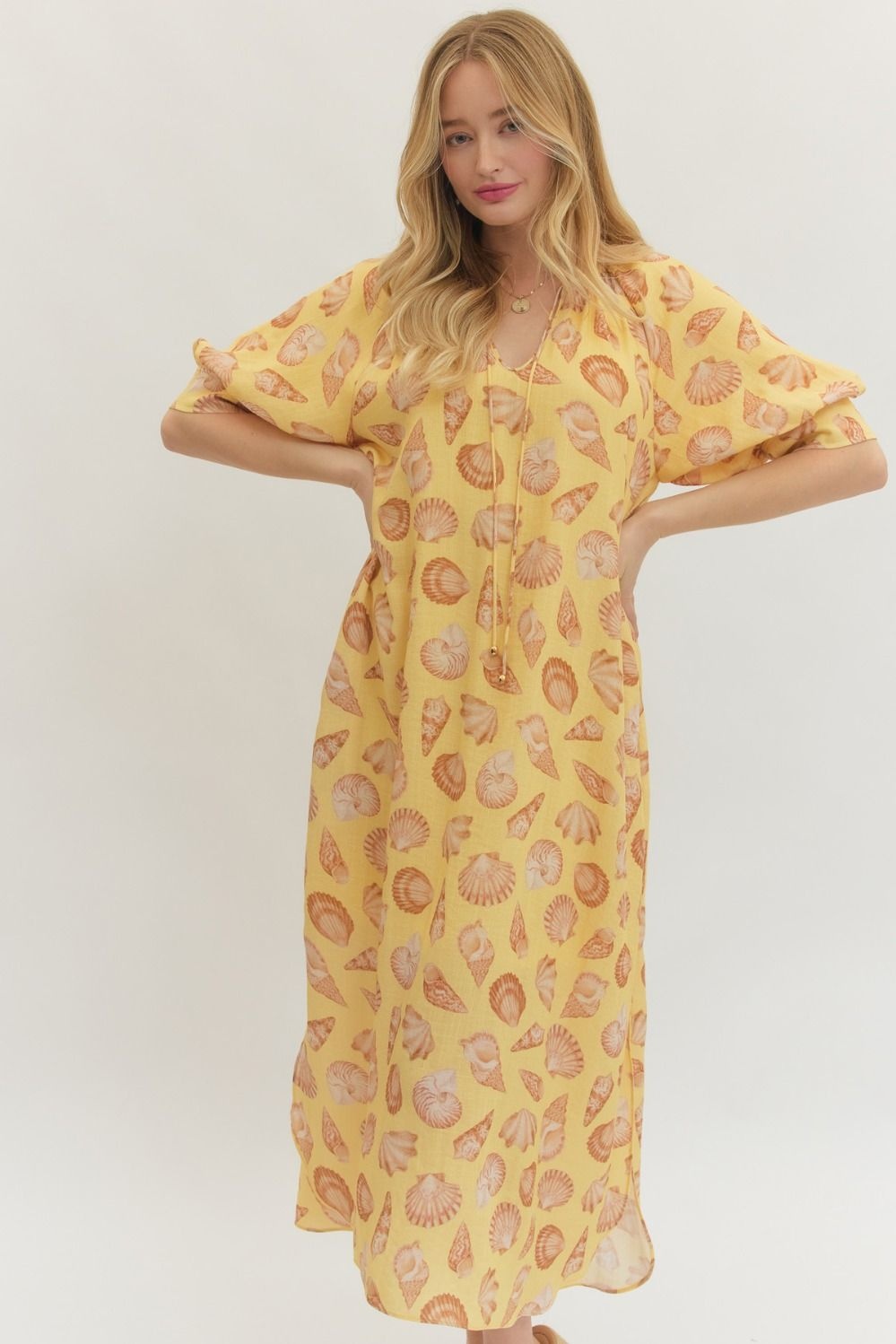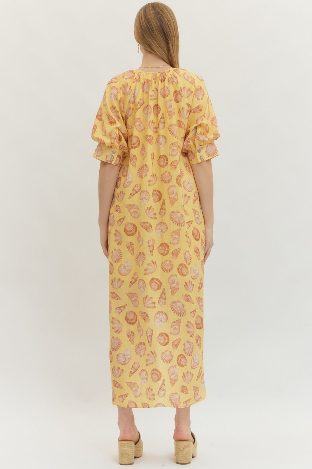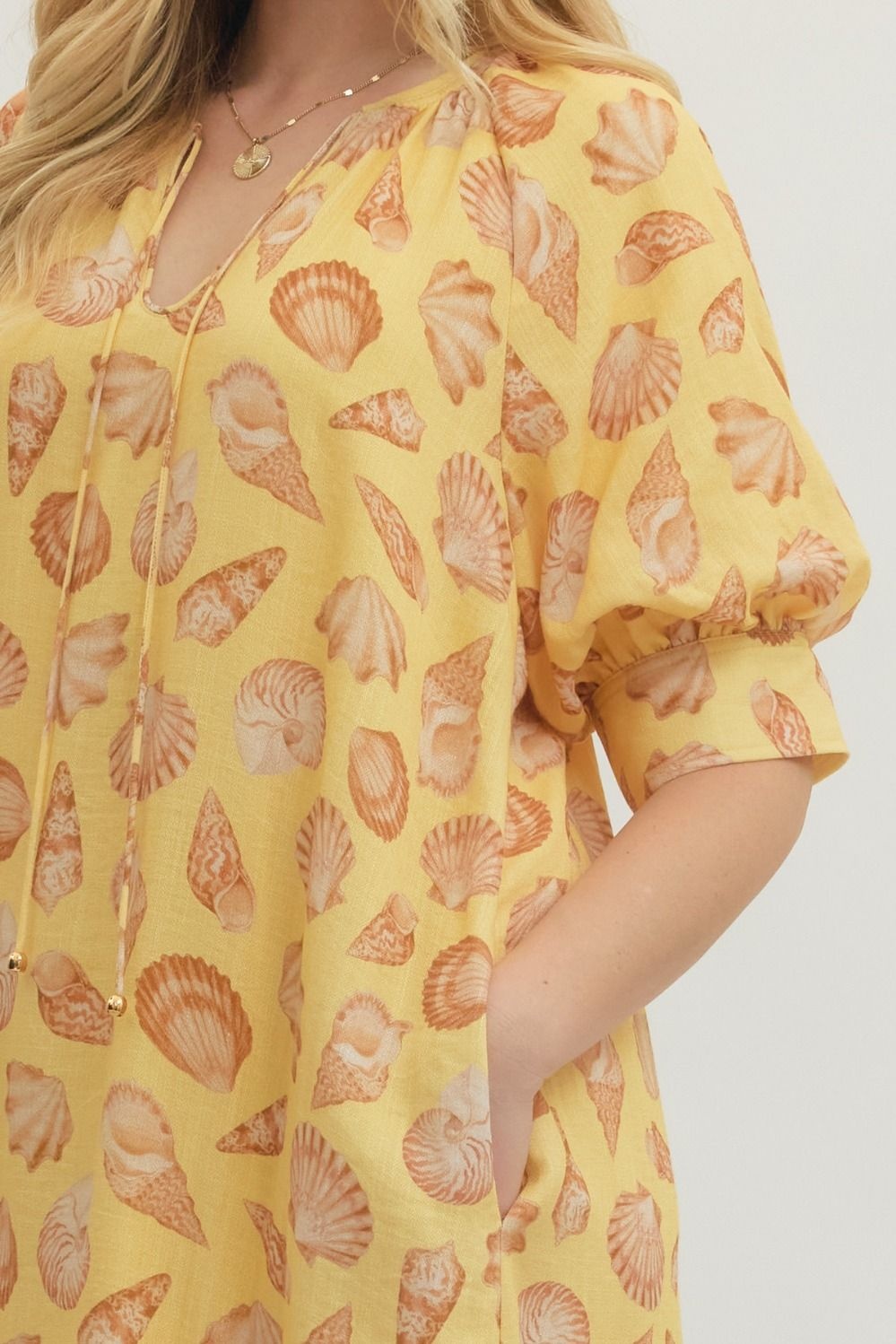 - Shell print short sleeve midi dress featuring tie neckline with tassel detail.