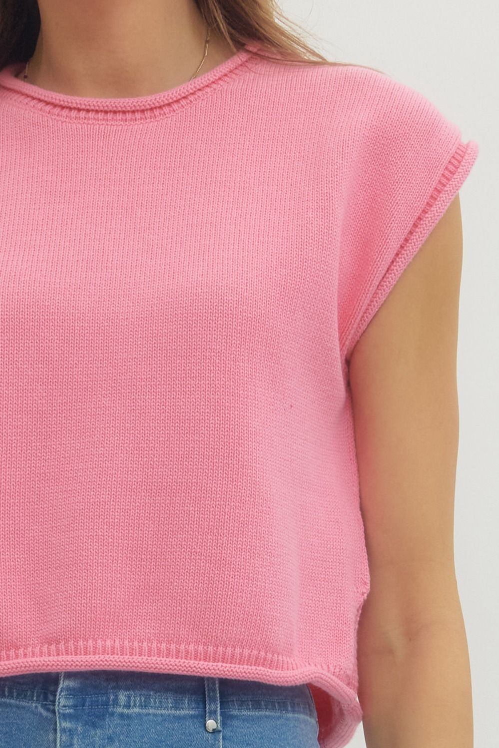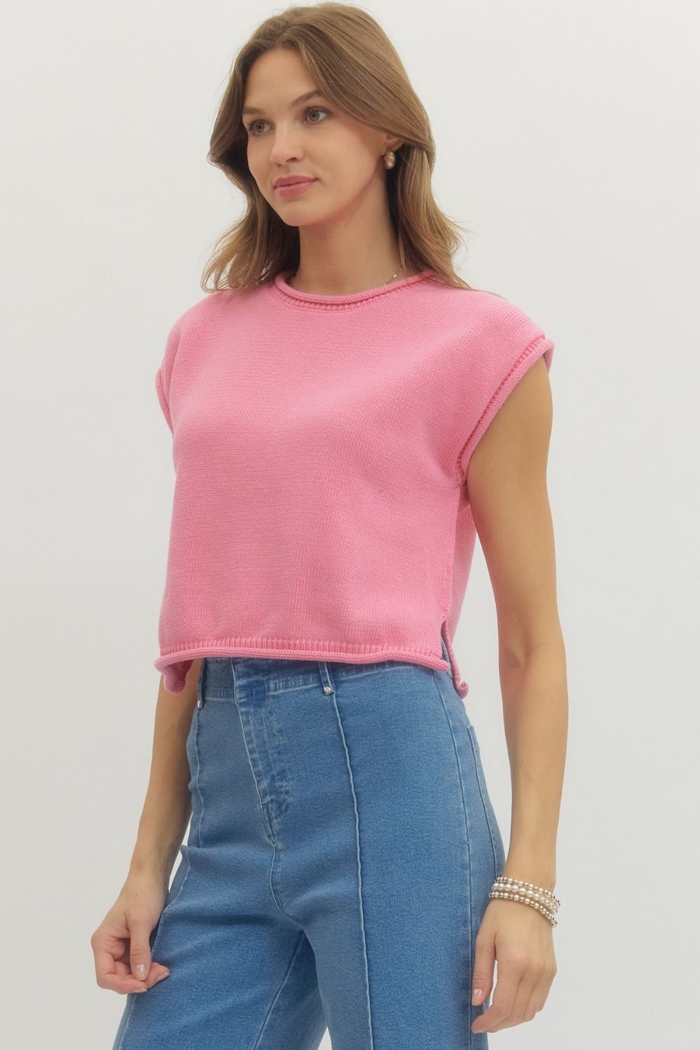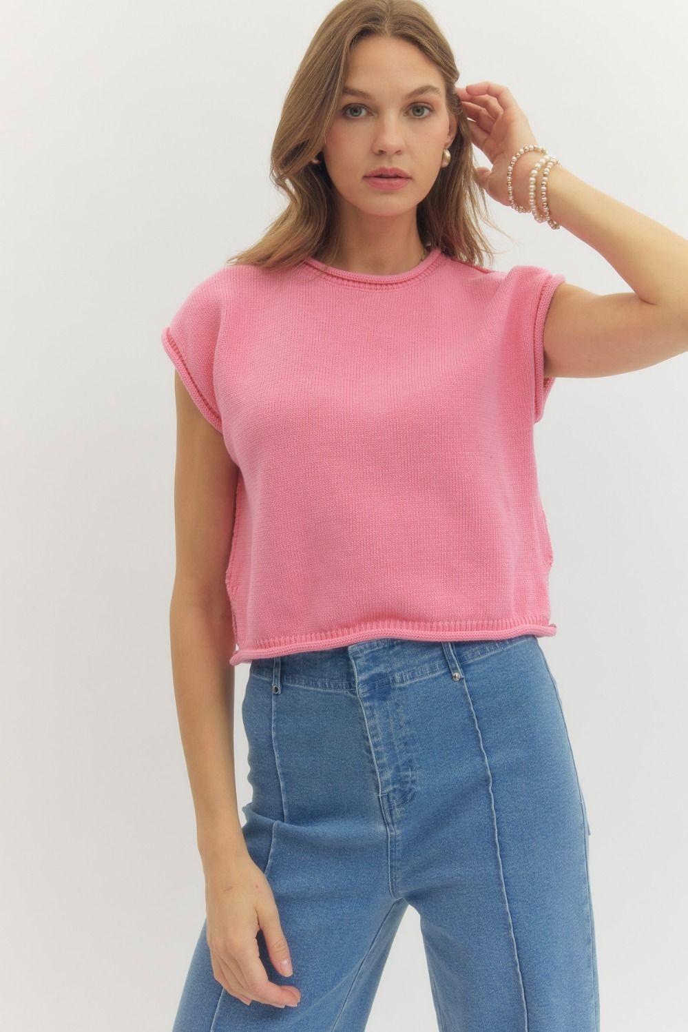 - Solid cap sleeve knit top featuring rolled edge detail at neckline and hem.