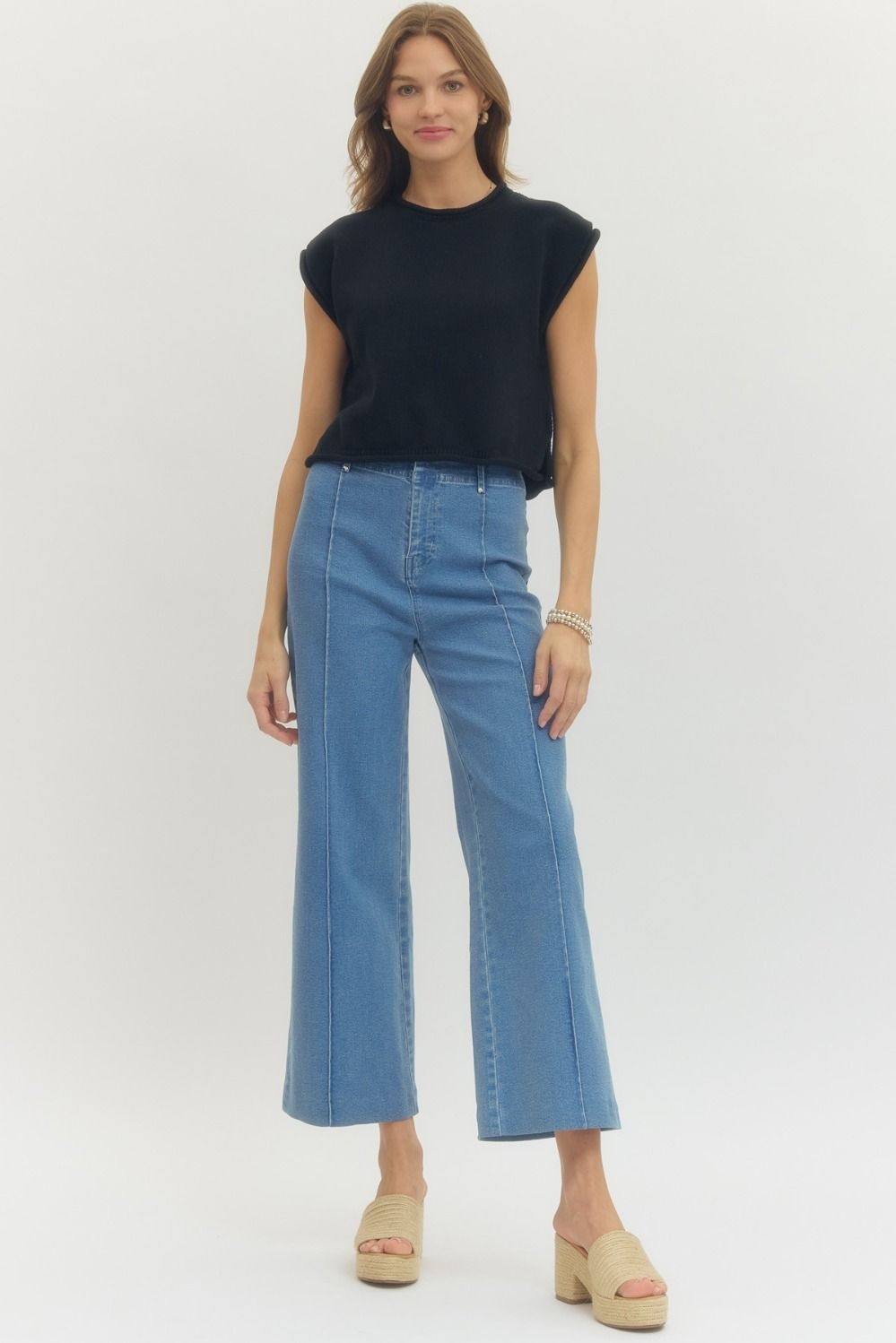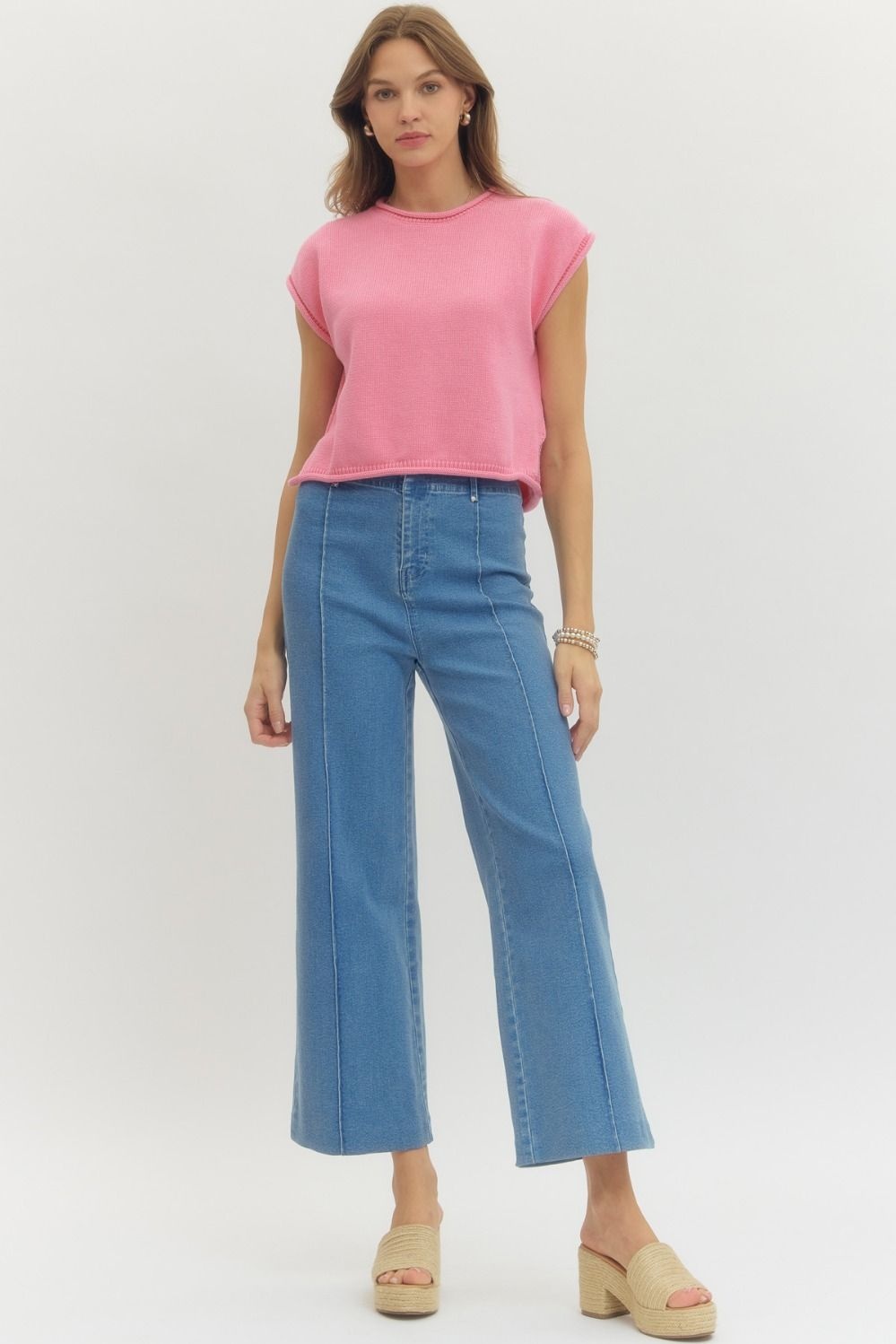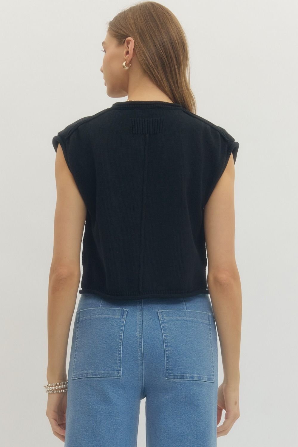 - Solid cap sleeve knit top featuring rolled edge detail at neckline and hem.