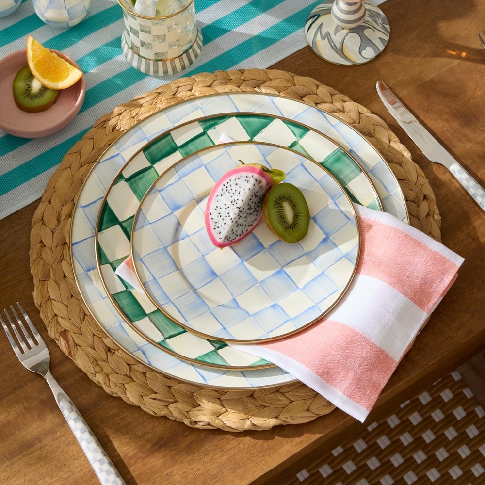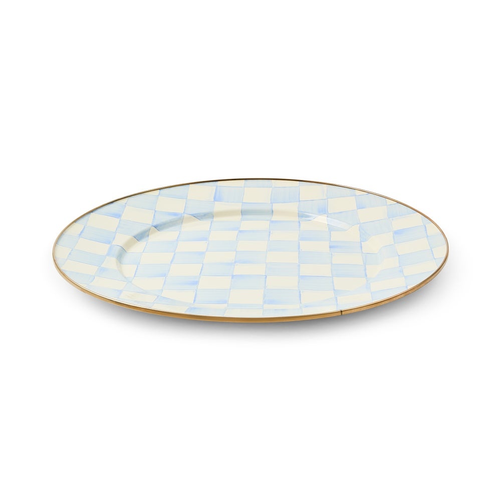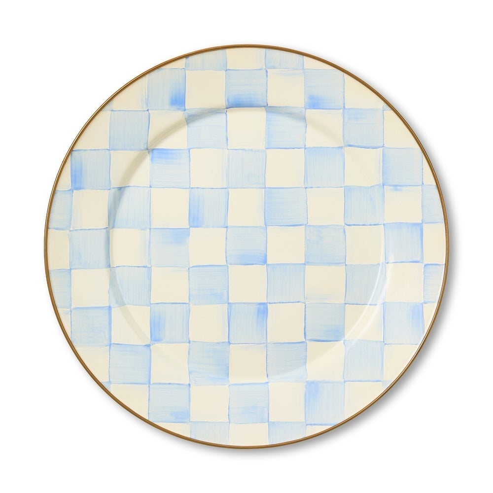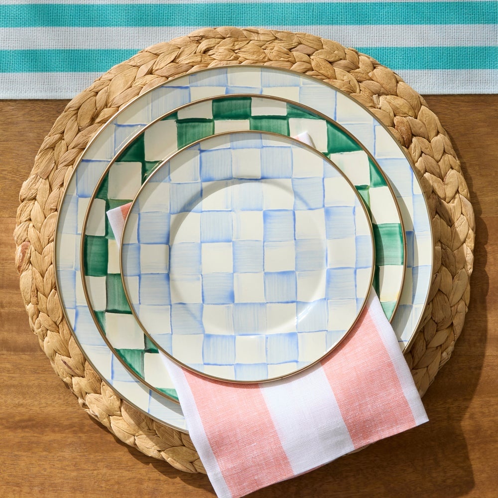 Heavy-gauge, hand-glazed steel underbody with hand-painted Sky Blue Checks, rimmed in bronzed stainless steel. Pieces may vary due to the handmade nature of each product. Imported.