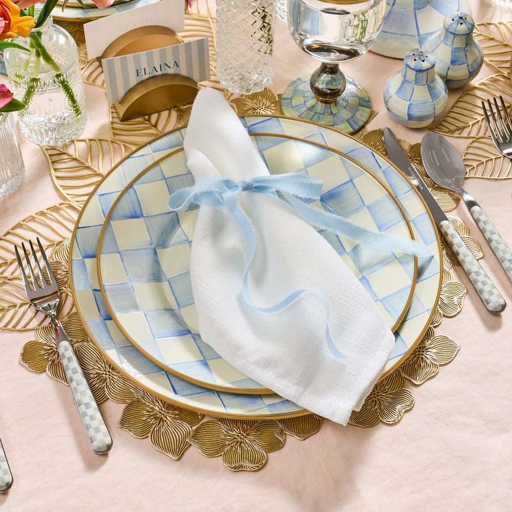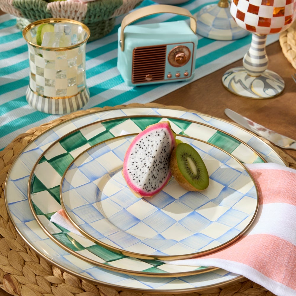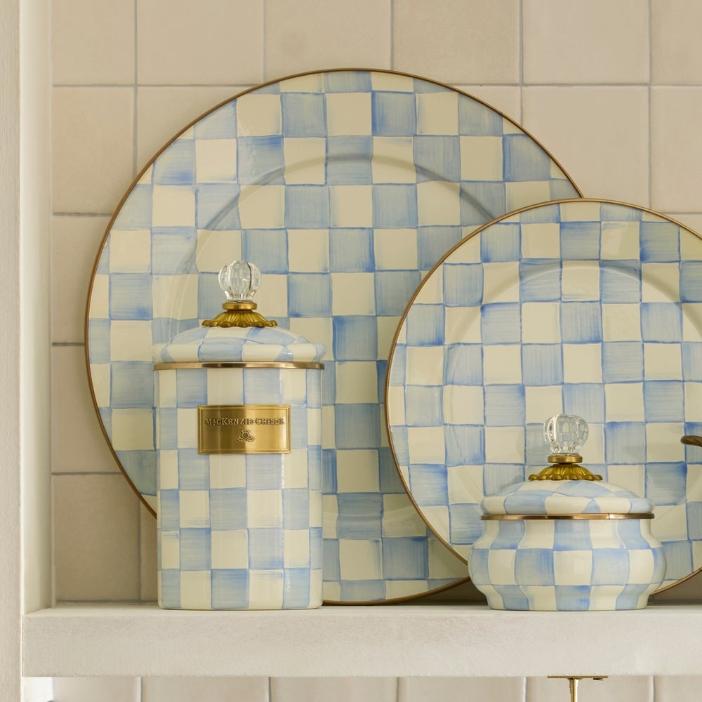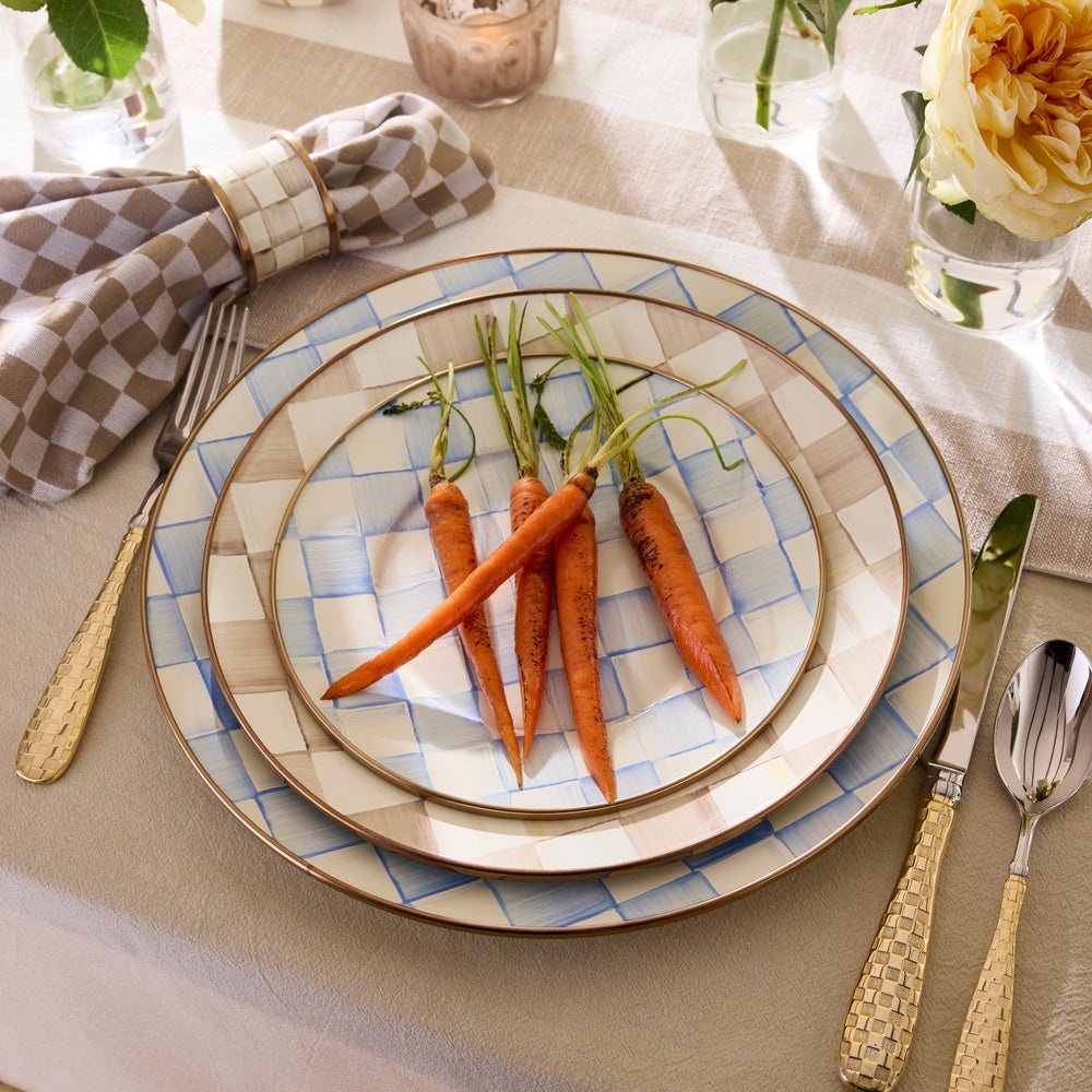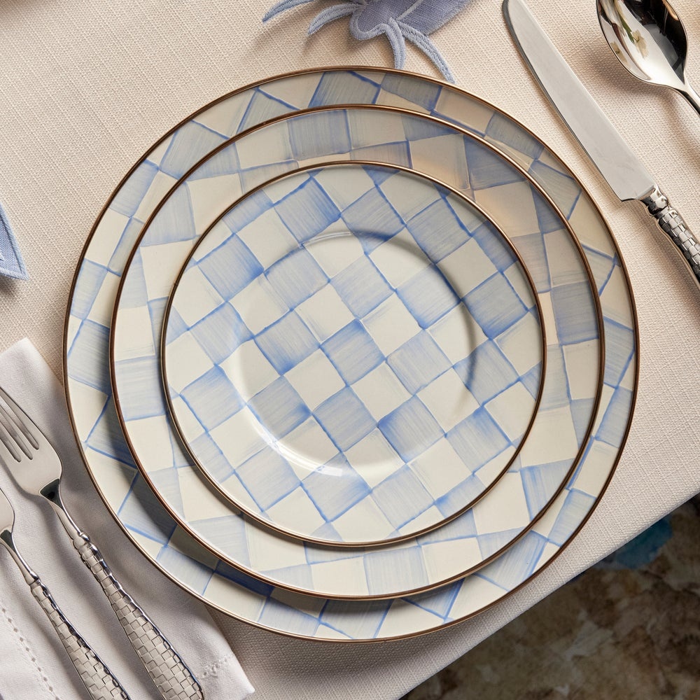 Heavy-gauge, hand-glazed steel underbody with hand-painted Sky Blue Checks, rimmed in bronzed stainless steel. Pieces may vary due to the handmade nature of each product. Imported.