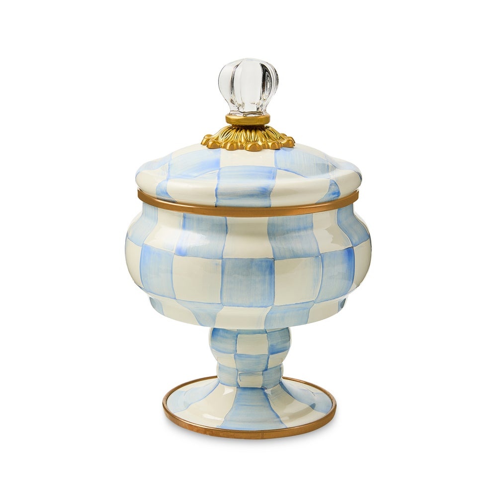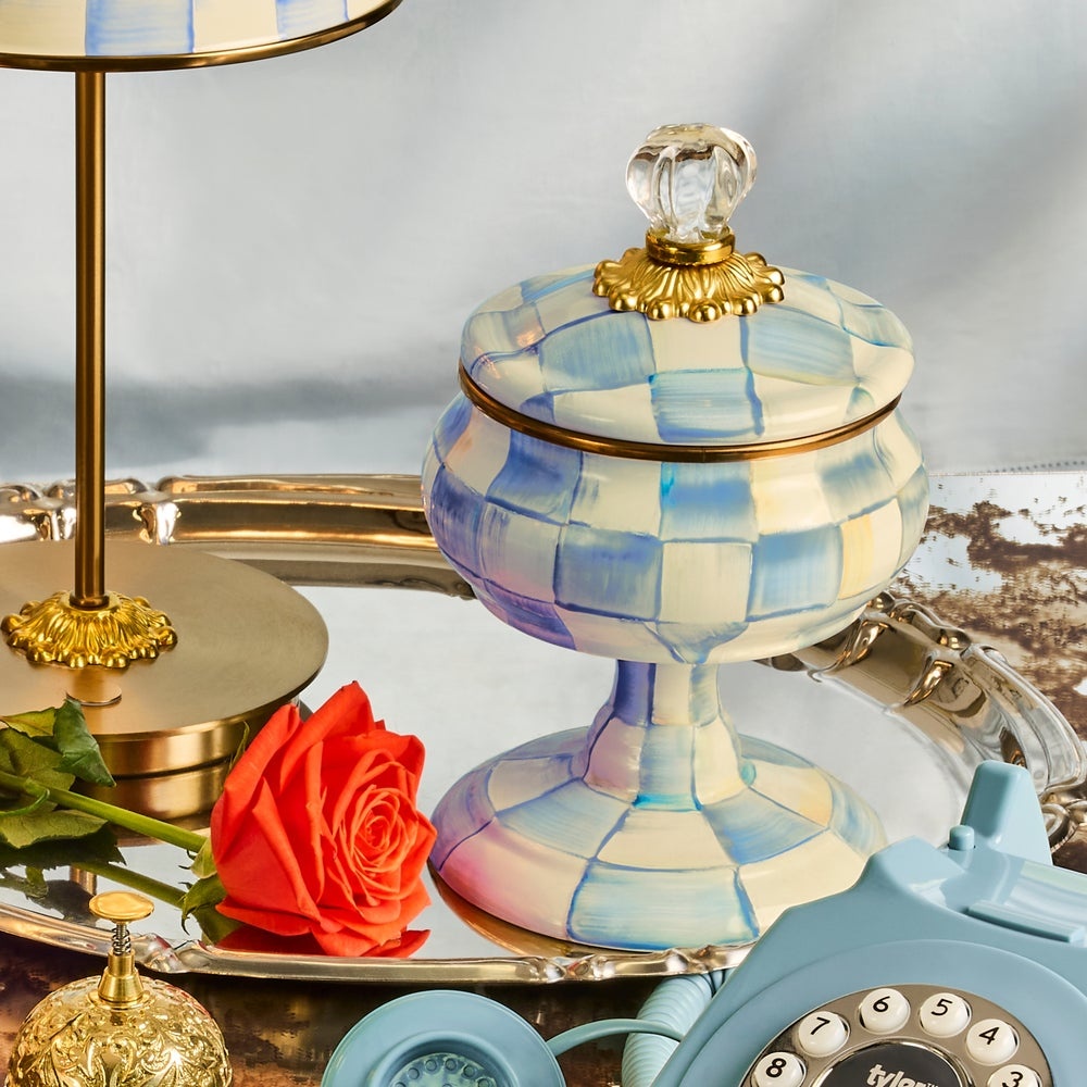Heavy-gauge, hand-glazed steel underbody with hand-painted Sky Blue Checks, rimmed in bronzed stainless steel. Glass knob and brass accents. Pieces may vary due to the handmade nature of each product. Imported.