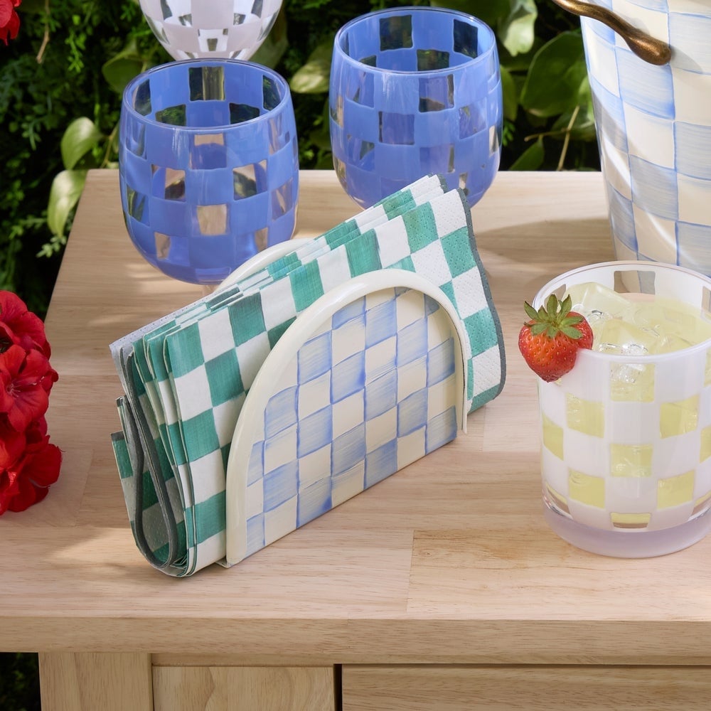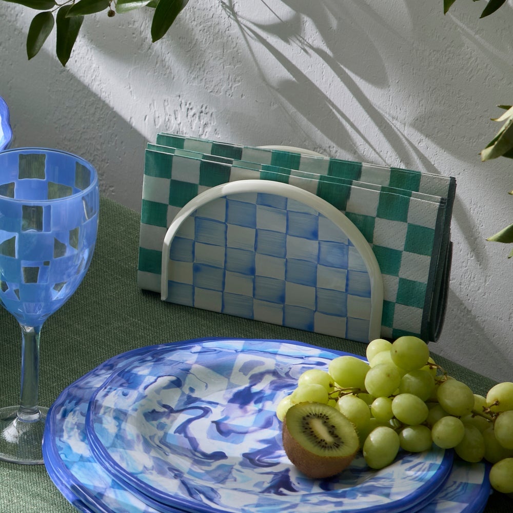 Heavy-gauge, hand-glazed steel underbody with hand-painted Sky Blue Check decoration. Pieces may vary due to the handmade nature of each product. Imported.