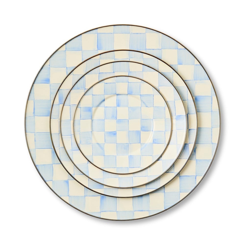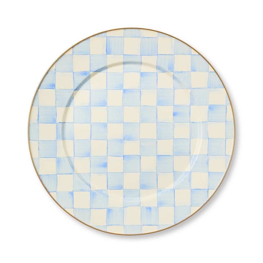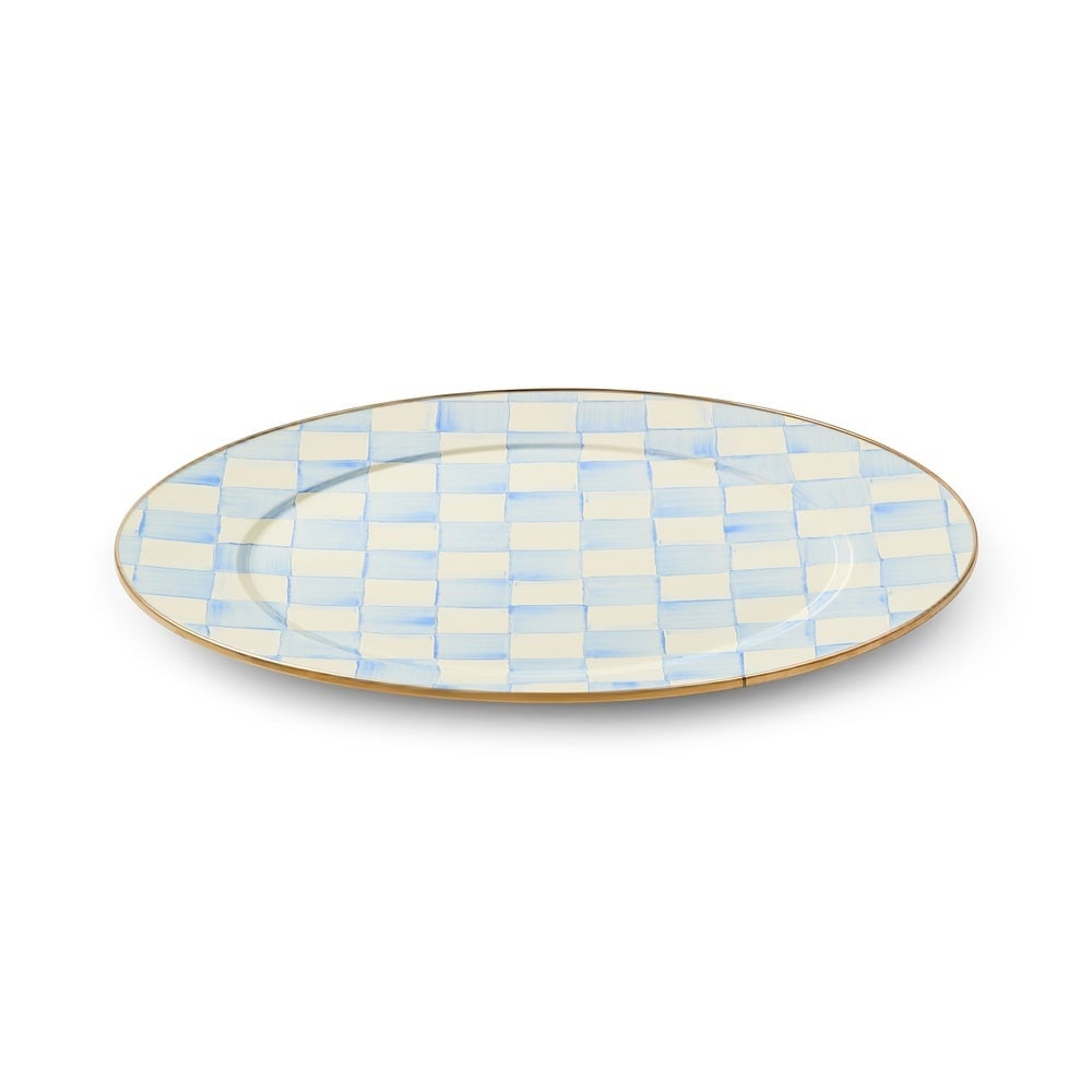 Heavy-gauge, hand-glazed steel underbody with hand-painted Sky Blue Checks, rimmed in bronzed stainless steel. Pieces may vary due to the handmade nature of each product. Imported.