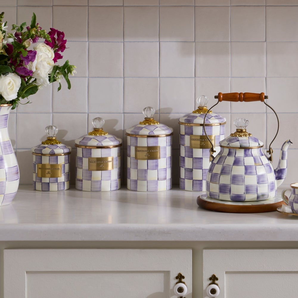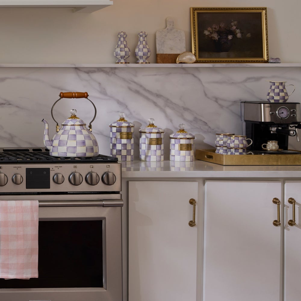Heavy-gauge, hand-glazed steel underbody with hand-painted Violet Checks, rimmed in bronzed stainless steel. Brass and glass accents. Silicone seal inside lid. Pieces may vary due to the handmade nature of each product. Imported.