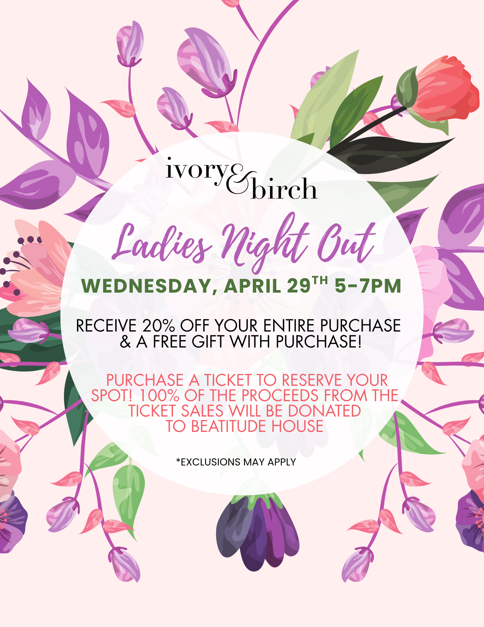 Wednesday, 4/29 Ladies Night Out - TICKET DONATION(0) $10.00 Excl. tax In stock (20) Available in store:Check availabilityAdd to cartLogin for wishlistQuick OrderFree shipping From $200.00DescriptionShareJoin us for a fun night out! Your $10 donation will go directly to the Beatitude House, and you'll enjoy a night of sipping, shopping and 20% off your purchase. You'll also get a fun gift with your $50+ purchase. Facebook Pin it WhatsappAdd to comparison list
